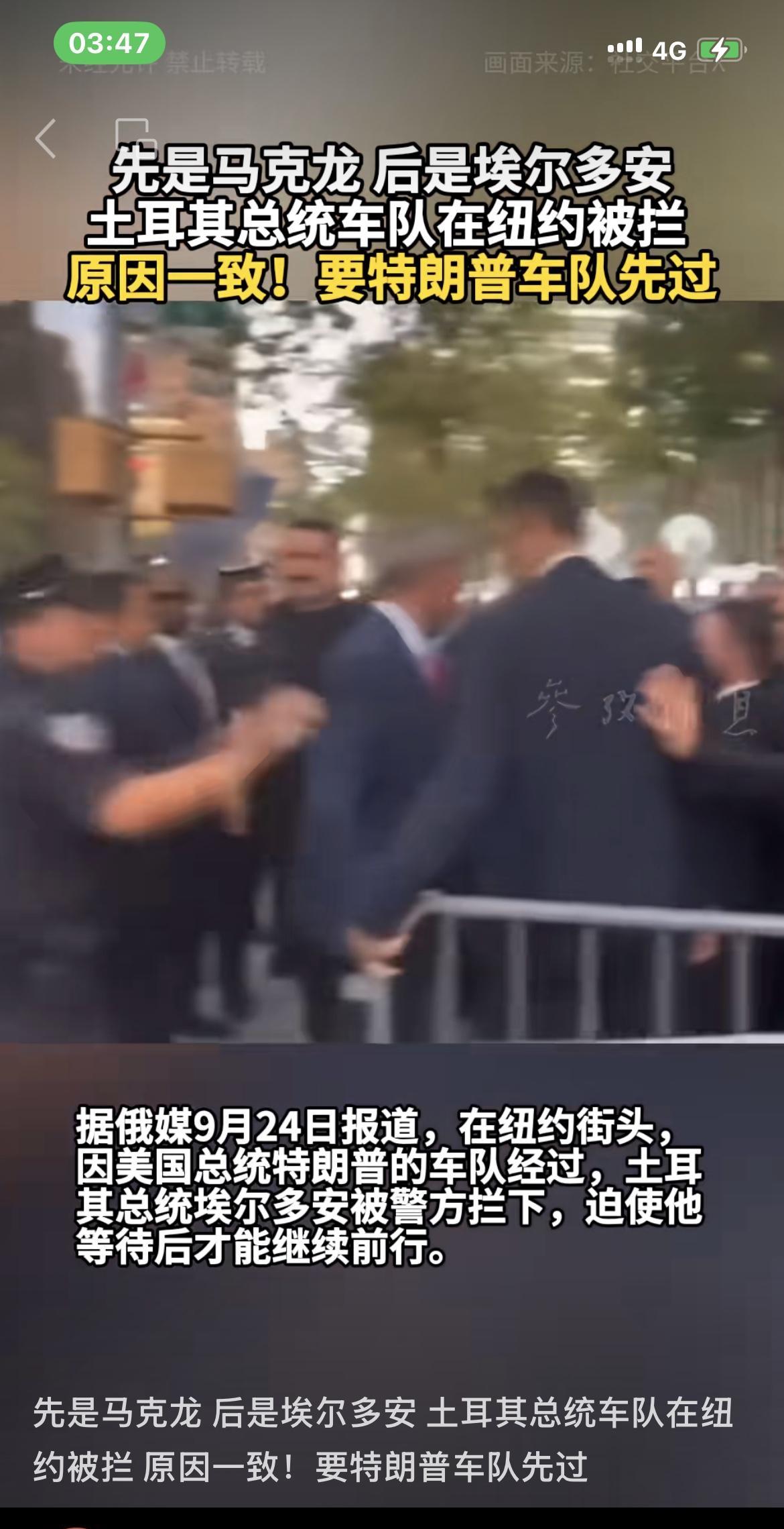 因给特朗普让路,这两位总统被拦站马路 环球网9月24日报道,在美国纽约街头,因特