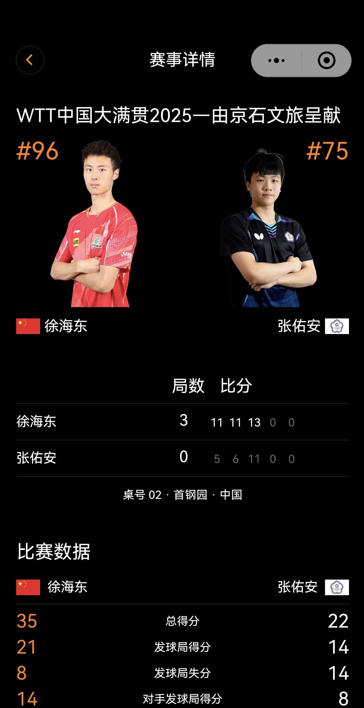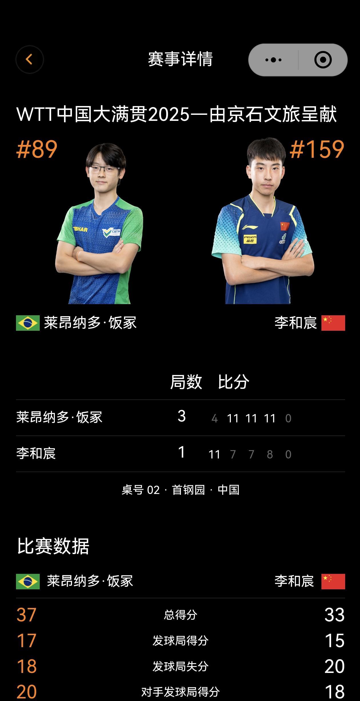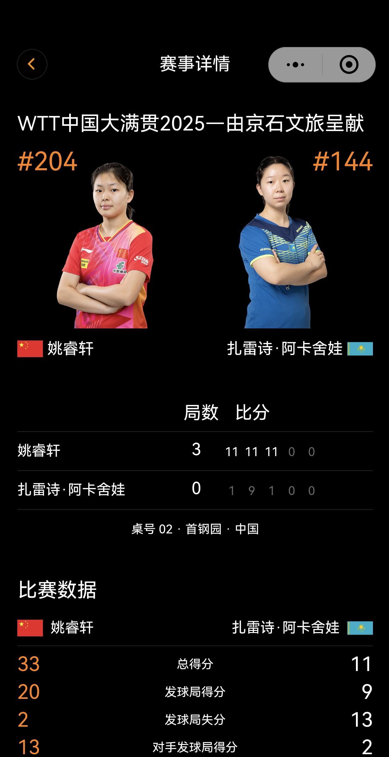 WTT北京大满贯2025(9.25-10.5),第一天,预赛开门红,国乒8位选手7位晋级下一轮。值得点赞的,国乒16岁女将姚睿轩(世排204)爆冷零封哈萨克斯坦阿卡舍娃(世排144)。两位削球手女将朱思冰、杨屹韵晋级。遗憾的是,男乒16岁小将李和宸1:3巴西莱昂纳多,没能晋级。#WTT中国大满贯#