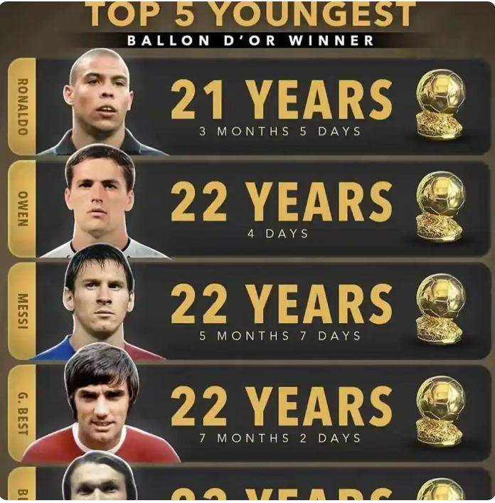 金球奖最年轻的获得者排名!你觉得这个榜单里面有几位是真正的名副其实的天才?我觉得大罗和欧文还是挺可惜的。这俩要不是伤病原因,他们的足坛成就可能会更高。当然就以梅西和C罗现在金球奖的成就,其他人应该是比不了的。目前新“双骄”哈兰德和姆巴佩到现在一个金球奖都没拿到过,而且年纪也都超过25岁了。以后只能看亚马尔的了,说不定明年巴萨拿欧冠,西班牙拿世界杯,世界上最年轻的金球奖得主就此诞生了呢。