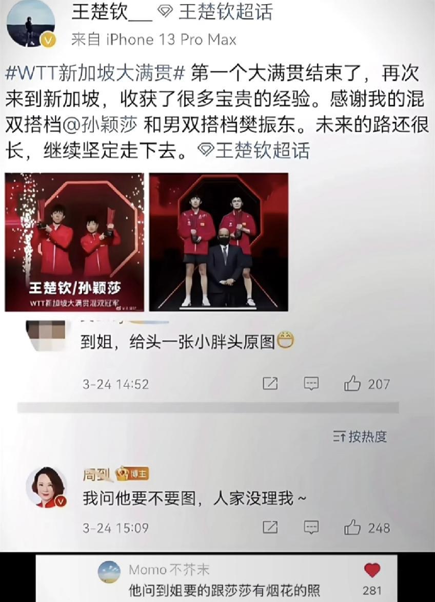王楚钦真浪漫! 他真的是一个细节又浪漫的人。 “我的混双搭档”,我的是我的[耶] 而且还只艾特了孙颖莎, 怎么没艾特樊振东呢[偷笑] 到姐好可怜,“人家没理我”~~~ 可是如果回个:不要。多尴尬啊,最好的回答就是装做没看到,浪漫专属一人。
