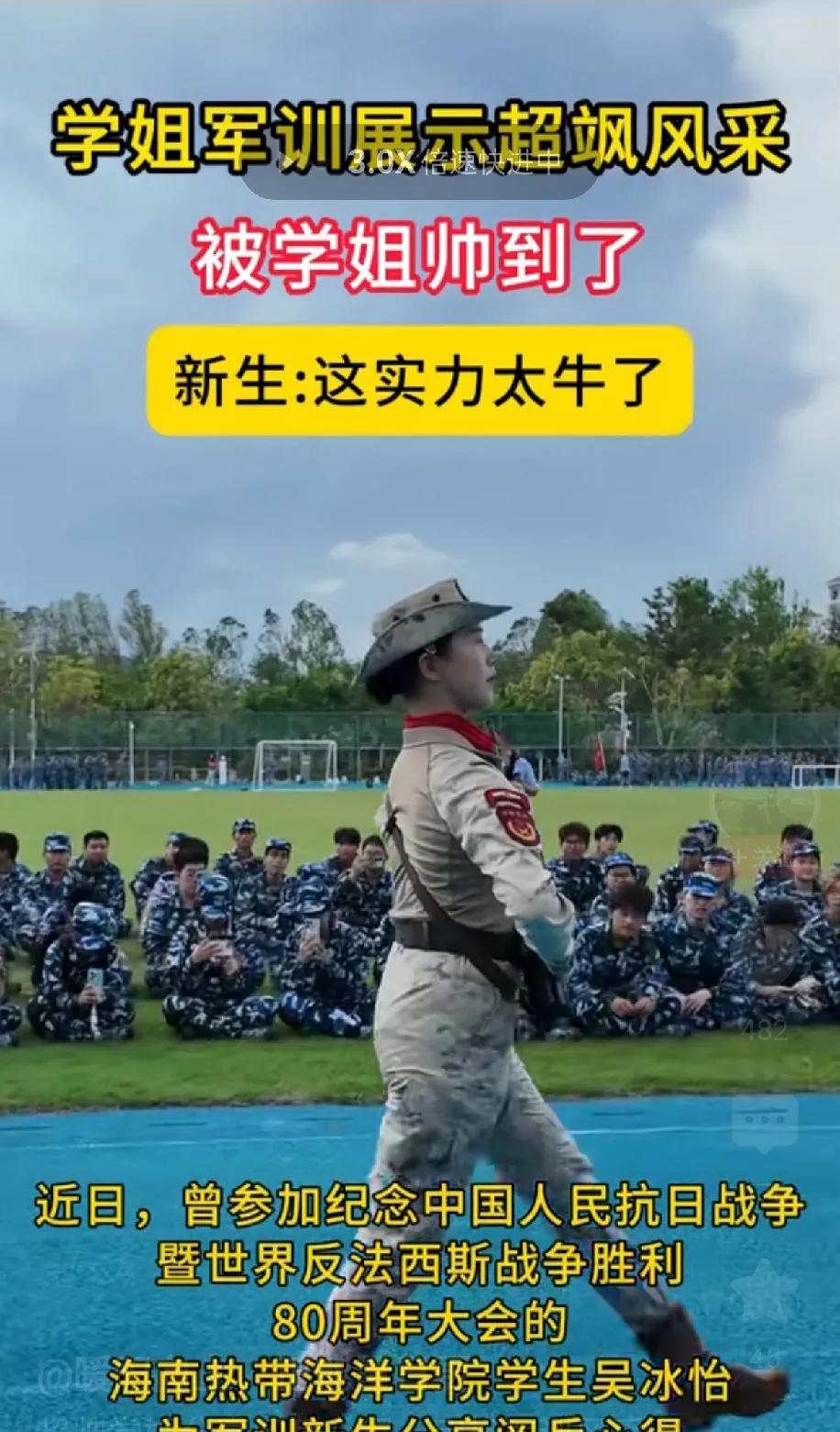 又美又飒的学姐给你军训是啥体验呢?海南热带海洋学院的大一新生,军训的科目太让人羡慕了!吴冰怡学姐专业而亲和的表演走正步,堪称楷模,这一堂课,给大一新生的心中种下一粒种子:在漫漫人生路上,一定要走正步、走直路,才能像吴学姐这样抵达人生的高处!这样的头雁领航,是很好的教育方式,值得大力推广! 吴冰怡,是冰清玉洁,是心旷神怡![赞] #秋日领花茶#
