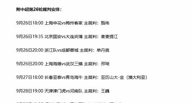 看中超第26轮裁判名单,安排澳大利亚人亚历山大·金执法长春亚泰vs青岛海牛的保级大战,无疑是一大亮点。 亚泰和海牛同积17分,谁赢下比赛谁就可能上岸。恰巧这两队都有中超底蕴,保谁不保谁真没法选,正好拿给两队自己比,洋裁判来判。 近期饱受争议的老麦复出执法京连之战,应该没啥难度,国安正常发挥就能主场胜大连;同样申花vs梅州、海港vs三镇因实力碾压,裁判不会成焦点。倒是浙江vs蓉城,今年曾在玉昆vs海港比赛关键进球中VAR“划线错误”的单丹奥任主裁,还真有看点,我看蓉城有点悬。