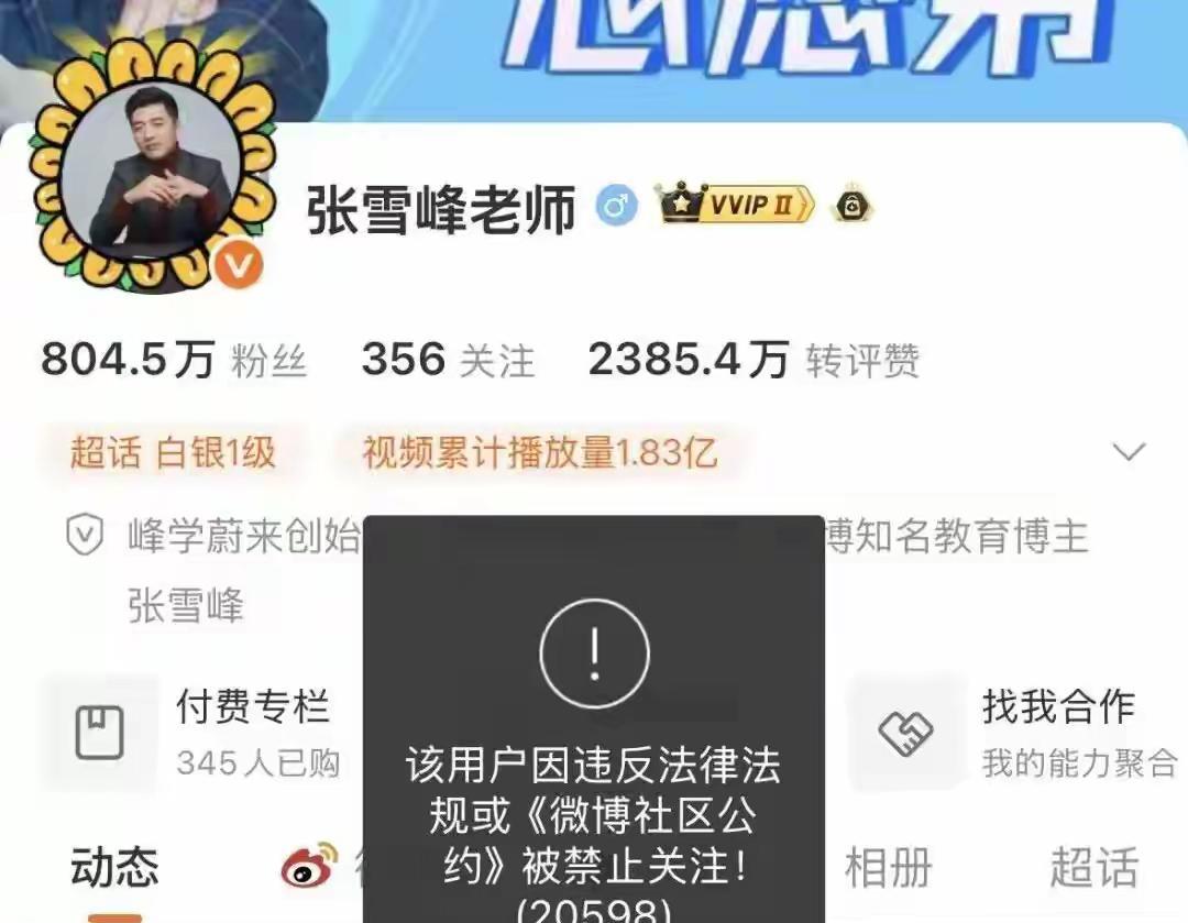 张雪峰和蓝战非被禁止关注,这是最轻的处罚,相当于警告。但实际并不影响什么,该直播还是可以直播的,粉丝数量足够多,没有新关注也没什么。赚钱的渠道一个也没有减少,照样直播收礼物,照样赚咨询的钱。