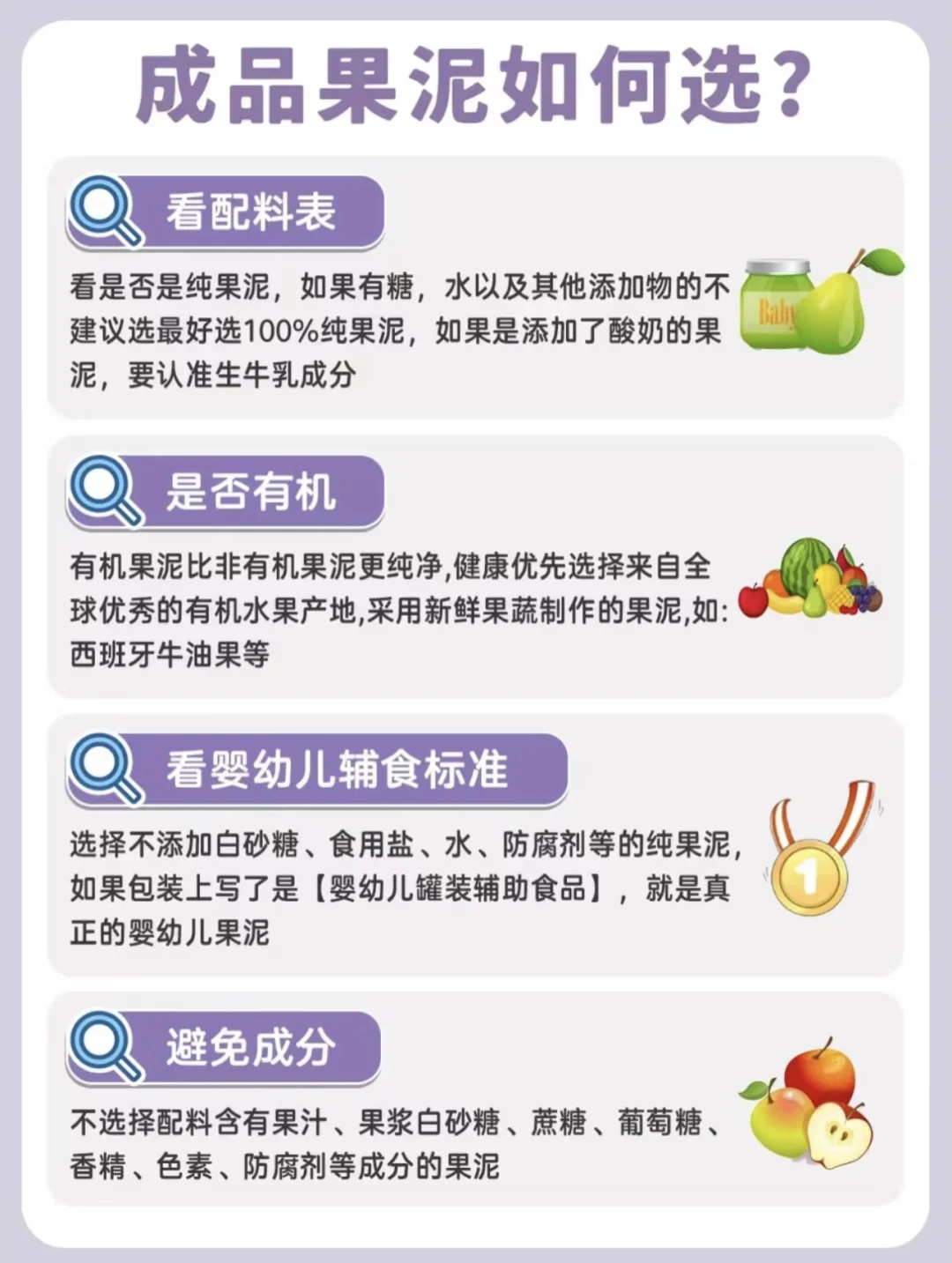 • 选成品果泥看配料表:前三位有糖、水的直接排除,优先纯水果成分的。