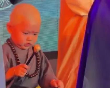 剧团演出“白蛇传”请了一个两三岁的小萌娃扮演小沙弥,剃了光头坐在戏台中间敲木鱼,