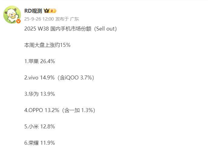 这是W38周国内排名 1、这一周最大的变化在于vivo终于不是第一了,在连续十四周国内排名第一之后,本周终于让苹果超越了; 2、iPhone 17系列首发还是猛,这国内份额直接超过四分之一了。预示着本周每卖出四台手机,其中就有一台是iPhone 17系列之一; 3、华为本周也好了起来,直接排名第三了。OPPO掉到第四,小米排名第五,荣耀排名第六。 PS:小米这应该是近三个月以来周排名新低,最主要的原因是大家都在等小米17系列,就像本周之前的苹果一样。