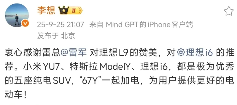 其实雷军和李想早就眉来眼去了,昨天在2025年度演讲上,雷军一顿狂夸l9,还推荐大家买i6,李想马上玩了个“67y”的梗,说i6、yu7和modely都是优秀的纯电5座suv。