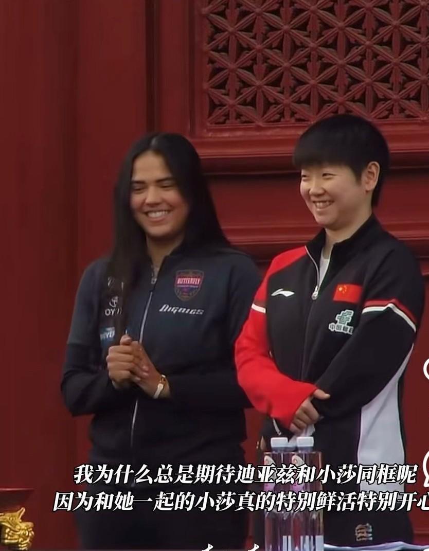 莎莎和迪亚兹在一块儿是真的开心。 今天莎莎和迪亚兹一起抽签,莎莎一把就给头哥抽到张禹珍了,在澳门冠军赛两个人刚交手过,这么快就又遇上了,莎莎在展示那个牌子时,迪亚兹还看着台下的王楚钦笑了。抽签结束后,主持人在翻译迪亚兹说的话时,莎莎和迪亚兹一对视,俩人就开始笑了,不知道俩人在笑啥呢,反正就是很开心。 看到主持人在采访莎莎时,问她对这次抽签选的地方怎么看,莎莎说这次抽签的地方,不管是风景还是路途都还是不错的吧。看到有网友说:“莎莎你确定不错,刚刚看到楚钦爬楼梯吐槽,这是谁设计的抽签仪式。” 看大迪、蒯曼她们一起在手机上看签表,大迪这次又和桥本在一个1/8区了,上次林诗栋给大迪抽到桥本,这次王楚钦又给大迪抽到桥本,看来大迪是非得过桥本这一关才行啊,大迪加油。而且这次比赛,迪亚兹首轮对桥本,迪亚兹也加油,全力以赴争取拿下桥本。