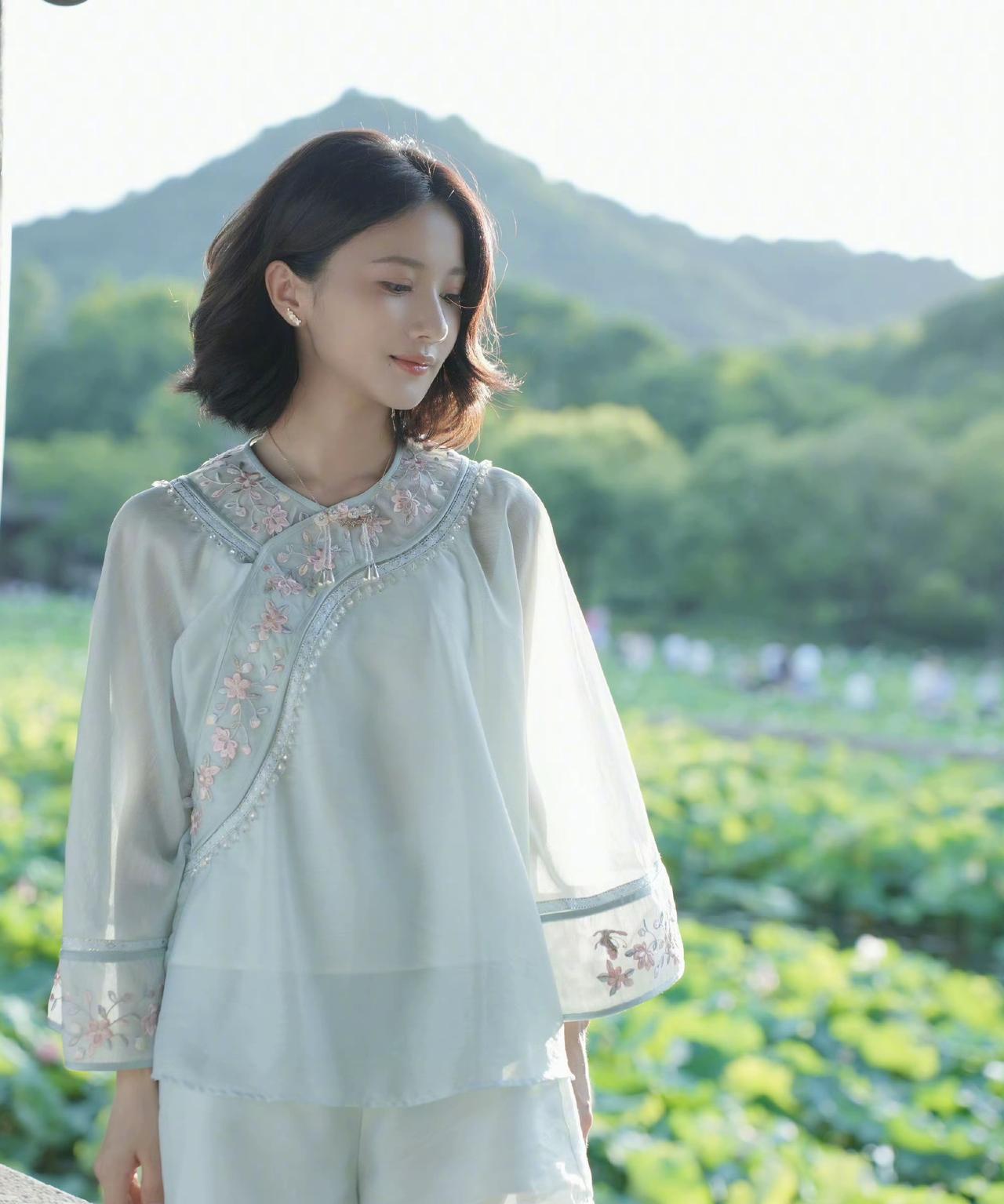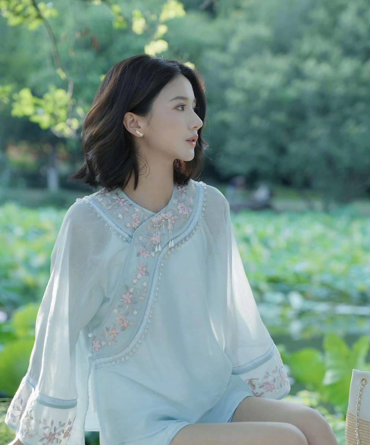 夏日清新穿搭,浅蓝色连衣裙搭配自然背景,优雅动人。