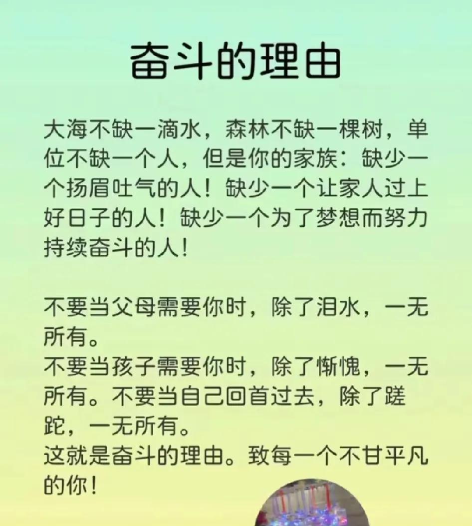 人这一生, 没有白走的路, 也没有白吃的苦, 跨出去的每一步, 单枪匹马你别怕, 一腔孤勇又如何, 这一路你可以哭, 世上没有白费的努力, 也没有碰巧的成功, 一切无心插柳, 用奋斗扬起生活的风帆, 攀登智慧的巅峰, 叩开成功的大门, 点燃光辉灿烂的明天。