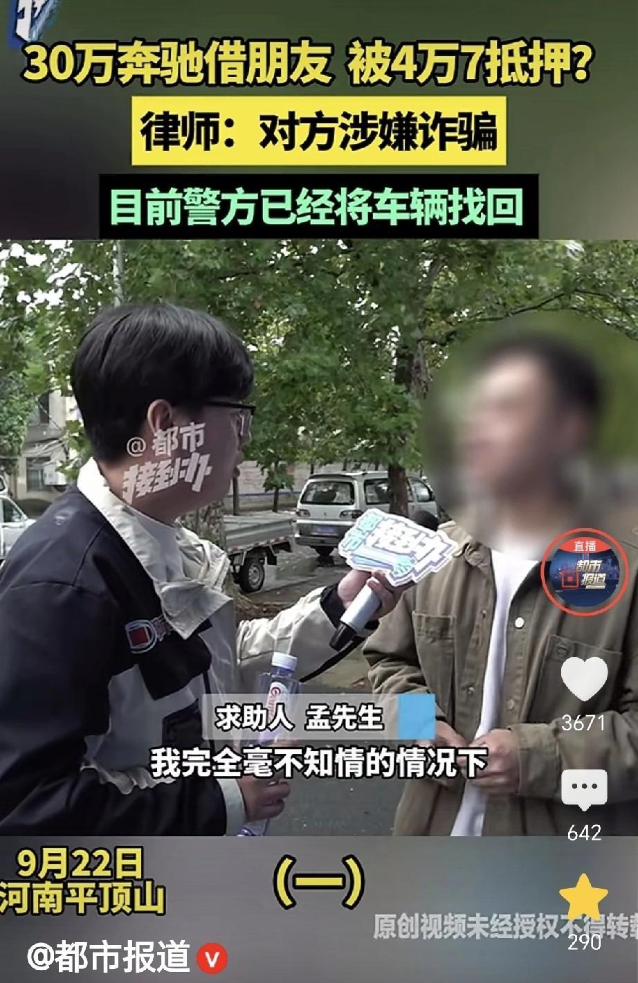 河南平顶山,一男子花30多万买了辆奔驰,才开了1年,朋友跑来借车,说她姥爷病危,男子二话没说,把车借给了她,朋友保证,下午5点就来还车,谁知等了2天,朋友发来消息,说她姥爷去世,她要帮忙料理后事,又过了2天,朋友又说,她父亲把车开走办事了,男子一查定位,车子压根就没移动,男子跑去一看,车子被停在一个荒芜小学校里,朋友求他不要报警,然后没了消息,警方一查,车子被朋友抵押了47000元,男子火冒三丈: 我从未想到,我把她当做朋友,她却把我当做傻子! 9月22日,孟先生请来记者,他十分气愤,他的一位朋友,借着朋友间的信任,借走他的车辆,一借不还,私自抵押,30万的奔驰被她抵押了47000元! 原来,孟先生花了30多万,买了一辆奔驰,这辆车他心仪已久,心心念念,好不容易买了回来。 他开车期间,十分的小心,车辆崭新,一眼就能看出来主人对它十分的爱惜。 孟先生的为人,十分的大气,对待朋友,更是实心实意,朋友们对他赞不绝口,朋友们需要帮助,孟先生总是尽力尽力。 9月15日这天,吴女士来到孟先生家中,吴女士是孟先生的朋友,认识多年,彼此之间十分的信任。 吴女士着急,她说自己接到消息,姥爷病危,她必须马上回家一趟,因此她需要借用孟先生的车用一下,她又赶忙说到,下午5点她就能赶回来把车还了。 孟先生最是孝顺,一听吴女士家老人病重,他没有犹豫,赶紧就把车钥匙给了吴女士。 孟先生不会想到,一个人会没了良心,拿自己家老人用来说事,可是,后面发生的情况着实令他开了眼界。 吴女士把车开走之后,当天下午她并没有回来,到了第二天时,孟先生不好意思多问,毕竟谁家都有老人。 他又等了一天,吴女士发来消息,说她姥爷病逝,她要留下帮忙料理后事,暂时回不来了。 孟先生心想,谁家都会遇到难事,既然老人已经去世,亲人送他最后一程,理所当然,他不忍心再催促什么。 可是又过了2天,吴女士又说,她父亲把车开走办事去了,孟先生心里生疑,这事蹊跷,好像有点不太对劲。 孟先生拿出手机,打开了手机定位,他这才发现,自己的车被停在一个学校,根本就没有移动过。 孟先生找到了那个停车的地方,可他进去一看,直接懵了,那里是一个小学校园。 学校里破旧不堪,一看就是荒废了多年,学校院子里大片的场地,上面停满了外地车牌的车辆。 孟先生心想完了,我这车算是废了,一定是被她拿去抵押掉了! 孟先生立刻联系吴女士,问她怎么回事,为啥撒谎骗人,开走车辆不给还了。 孟先生指责她说,你再不要和我说这说那,吴女士看瞒不住了,她求吴先生不要报警,是她确实有事情了。 再到后来,她就不太回消息了,孟先生再也不信她的谎言,坚持拨打了报警电话。 警方迅速行动,很快将他的车辆追了回来,暂时停放在派出所院子里面。 工作人员告诉孟先生说,吴女士根本没有所谓的姥爷病危去世,全部都是她编造的谎言。 她利用孟先生对她的信任,把孟先生30万的奔驰车给抵押了出去,抵押款只有47000元。 孟先生就想不通了,他不明白,他一直厚道待人,他的朋友们也都知道,如果吴女士真的遇到难事了,完全可以给他明说。 真没必要借助孟先生对她的信任,满口谎言,编造家里老人病重,博取同情,借车不还,还把车辆私自抵押掉了。 孟先生心里难过,他告诉记者,我从来没有想过,我把她当好朋友,她就把我当做傻子,你说我30多万买一个奔驰,然后47000就给我抵押了,她凭什么呀…… 目前,吴女士应该已经被警方留置,警方要孟先生做了笔录,孟先生的车停在警方院子里,孟先生也放心了。 孟先生也该吸取一下教训,不要再把车辆随意借给别人,有些人没有底线,不择手段,不到事上,你根本看不出来对方的品质。 那么,这件事在法律上是怎么认定的呢? 《民法典》第240条规定: 所有权人依法对自己的不动产或动产享有占有、使用、收益和处分的权利。 吴女士作为借车人,并非车辆所有权人,无权对车辆进行抵押处分。 她私自将孟先生的车抵押给他人的行为属于无权处分,该抵押行为无效,孟先生有权要求返还车辆。 《民法典》第235条规定: 无权占有不动产或者动产的,权利人可以请求返还原物。 孟先生是车辆的合法所有权人,而吴女士在未经孟先生同意的情况下,将车抵押给他人,导致车辆被他人非法占有。 孟先生可以基于所有权人的身份,要求非法占有人返还车辆。 《刑法》第266条规定: 诈骗公私财物,数额较大的,处三年以下有期徒刑、拘役或者管制,并处或者单处罚金。 吴女士虚构姥爷病危的事实向孟先生借车,随后又编造各种理由拒不还车,私自将车抵押,符合诈骗罪中虚构事实、隐瞒真相、意图非法占有他人财物的构成要件。 如果吴女士的行为经法院审理认定构成诈骗罪,她将会承担相应的刑事责任。 对此,你怎么看?欢迎评论区留言讨论。 关注@王哥说法 多学法律少吃亏!