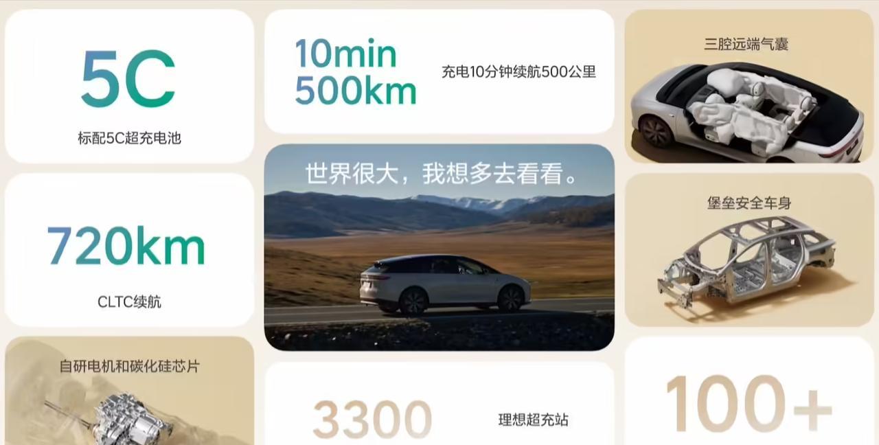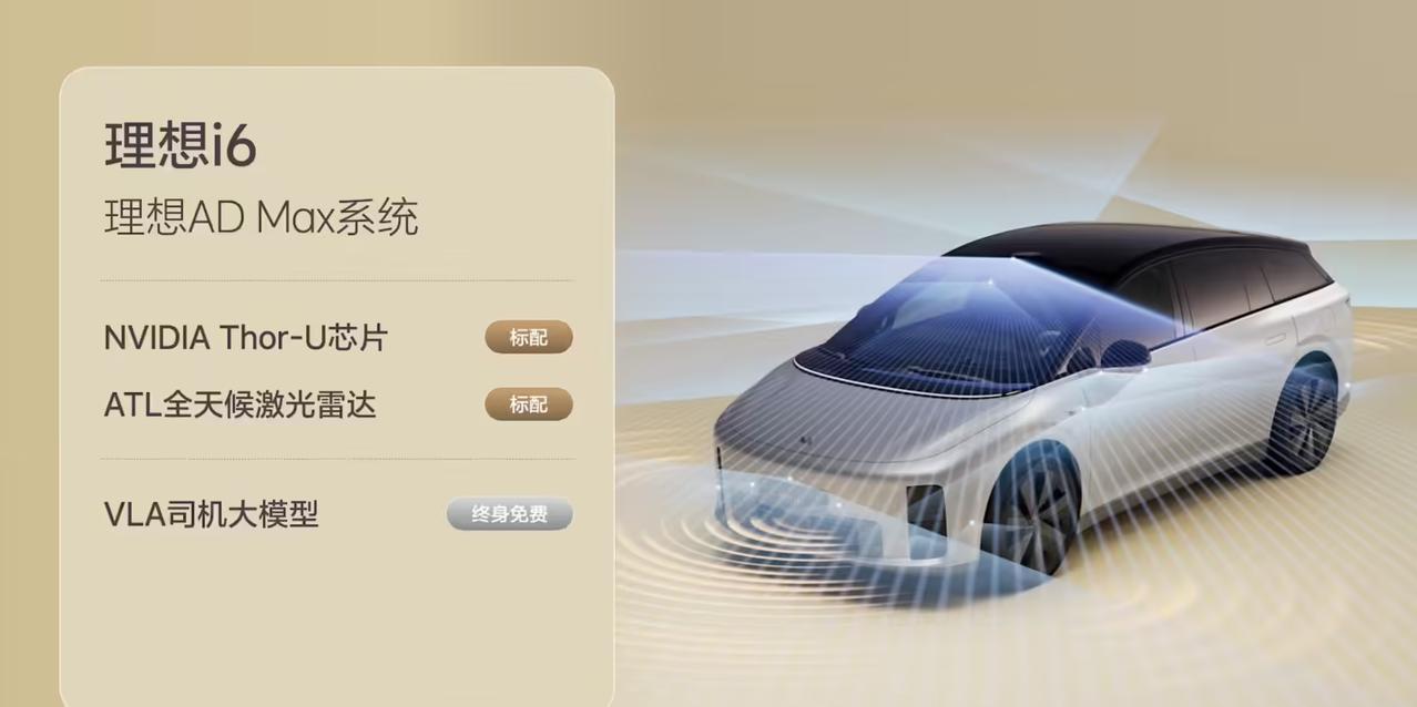 理想下半年的王炸车型理想 i6 发布,依旧和同级增程车理想 L6 价格保持一致,售价 24.98 万元,限时送双腔空悬、冷暖双用冰箱、全车电吸门,没有乱七八糟的版本,标配即顶配。 整车尺寸 4950×1935×1655mm,轴距 3000mm,五座布局,骁龙 8295P 座舱芯片,前排 16.8 英寸抬头显示、3K 双联屏,后排提供 21.4 英寸 3K 大屏,内置理想同学 MindGPT 大模型,全车匹配 20 个扬声器,同时支持无麦 K 歌模式; 标配英伟达 Thor-U 芯片,ATL 激光雷达,标配理想 AD Max 系统;5C 磷酸铁锂电池,支持 5C 超级充放电,最大峰值功率>500kW。后驱 CLTC 续航 720 km,充电十分钟补能 500 公里,百公里电耗 13.6 kWh;可选智能后驱单电机、智能四驱双电机版本,后驱版功率 250kW,四驱版功率 150kW + 250kW。