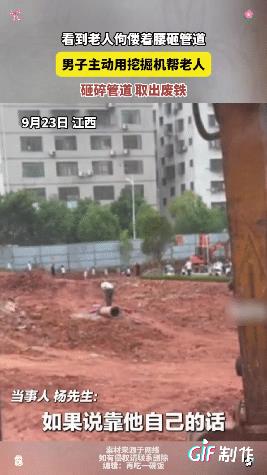 太暖心了!江西一开挖掘机的男子在工地上干活,不然他看到前面有一个大爷在敲一个水泥钢筋的废弃管道,想要拿里面废铁卖掉,可大爷速度太慢了,于是男子做出了一个决定,接下来发生的一幕把我给感动到了! 江西一男子去工地里面开挖掘机干活,他看到一个大爷拿着一个锤子佝偻着背在工地上敲打一个水泥钢筋的废弃管道,想要把废弃的管道表面的水泥敲掉,然后拿里面的铁拿去卖钱。 男子坐在挖掘机上面看着大爷佝偻着背干了好一会儿,动作很慢,于是男子做出了一个决定。 他把掘机开到那个废弃管道,大爷看到挖掘机开过来后立刻明白了男子的意思。 随后男子把管道从泥土里面挖出。来,然后又用挖掘机一点点的帮老人敲碎废铁表面的水泥。 没一会儿的功夫,挖掘机就把钢筋表面的水泥完全都砸碎了,露出了一条条废弃的铁。 男子帮老人干完这件事情后感到心情很愉快,男子还表示,他帮助老人砸掉废铁里面表面的水泥,仅仅是为了帮助老人,更是为了自己方便干活。 可令男子万万没有想到的是,他帮老人砸完废弃管道后就开挖掘机转身离开了,没想到老人却对男子做出了深深的作揖感谢,男子心里面特别感动。 这么大的钢筋水泥管道,要是老人靠自己一点点的砸开的话,肯定得花很长的时间,但是男子用挖掘机几下子就把它全部弄好了。 可见男子是多么善良的一个好人,同时男子也表示自己做了好事情心里感觉很快乐,男子不仅仅是帮助了老人干事,帮助自己拥有了一个好心情。 为男子的举动点赞!