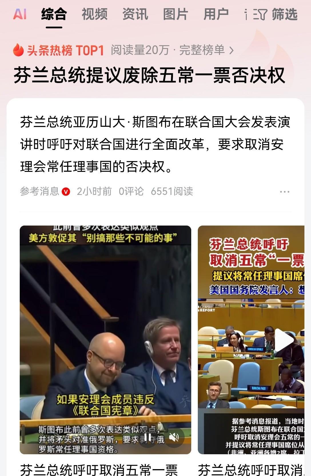 芬兰这个国家好像没有搞明白状况,身为一国总统,他连联合国是如何建立起来的都不明白。 据芬兰媒体报道称,美国当地时间25号,芬兰总统斯图布,在联合国大会上发表讲话。 他呼吁对联合国进行改革,尤其是要取消安理会常任理事国的一票否决权! 此言一出,顿时引起一片哗然,芬兰总统这是直接往根上砍啊! 其实联合国理事会这个一票否决权,确实备受争议! 国际社会上很多大事就是因为一票否决权而干不成。 就比如说巴勒斯坦建国这件事,美国长期拿着一票否决权,把提案牢牢的挡在门外! 世界各国对此非常愤怒,但是却毫无办法,因为制度就在这摆着呢。 但是如果你说要把这项制度给废除,那真的是不现实的,就好像印度人常说要把五常给废掉一样,那都是不现实的。 我们要明白一个因果关系。 是先有五常之后才有了联合国。 为什么会有5个常任理事国呢? 因为这是二战最主要的胜利国,出力最多的。 当然了,法国的功劳大小确实值得商榷,但是法国在当时也确实是一个很重要的欧洲国家。 因为戴高乐的努力就把法国给加进去了。 所以大家要明白一点。 是强大的军事力量,决定了谁才能当常任理事国。 是强大的军事力量战胜了纳粹,赢得了二战! 也是这股强大的军事力量,保证了联合国的建立,保证了联合国的权威性。 所以说在联大之上,还有一个安全理事会,这里就是可以动用军事手段的地方了。 这个制度出现的目的就是希望全世界5个最强大的军事体。 能够团结在一起,共同稳定世界的和平。 什么地方出现了野心家呀? 或者好战分子什么的。 5个国家就一起把它打压下去。 从而保证全世界的和平。 当然了,这几十年的发展,英国和法国已经名不符实了。 但是中美俄这上三常,还依然很强劲。 基本上这三个国家控制了全球95%以上的军事力量。 其实比95%还要多。 因为蘑菇弹的力量是不可量化的是不可测的。 那是一股毁灭性的力量。 所以印度人经常说要废掉五常制度。 结果全世界政治人物看印度人,都跟看傻子一样。 你要废掉五常制度,说白了就是要跟全世界95%的军事力量对抗。 你觉得他们那个脑袋聪明吗? 现在波兰总统斯图布的话,一样也犯了大忌讳。 他虽然没有说废掉五常制度,他说要废掉一票否决权。 也就是说他根本就不知道一票否决权的重要意义。 一票否决权当然有它的局限性了。 但是也有它的高明之处。 那就是绝对不让5个国家形成阵营。 他在想尽一切办法让这5个国家达成某种妥协或者统一。 大家想想,如果搞多票战胜少票的那种制度。 也就是说少数服从多数。 这种制度你看似公平,实际上就是最大的不公平。 因为这不是5个孩子。 这不是5个普通人。 这是世界上5个强大的军事大国。 他们的本质是强权和不讲理的,如果你搞少数,服从多数的投票。 少数的那两个国家一定会不服气,一次两次可以。 次数多了,他必定会有反弹。 到时候就会形成两大阵营割裂,矛盾冲突再大了就会发生大规模的军事冲突。 所以设计这个制度的人就巧妙的利用了一票否决权。 它的本质目的是,宁可让这个事做不成。 也绝对不能让5个最强大的军事体爆发对抗和战争。 这个事做不成了就做不成了,大家都不开心。 但是总比一部分人开心,一部分人不开心要强! 大家明白了吧,不患寡而患不均。 不是对人性有深刻揣摩的人,根本就设计不出来这样的制度。 一票否决权。 他会保证5个常任理事国要么都开心,要么都不开心。 这样其实没什么大问题,顶多就是事儿办不成嘛! 可是如果你搞少数,服从多数那一套。 那绝对会爆发战争的,因为少数服从多数就会强迫一些政策出台。 就会强迫一些事情办成。 而这些强迫办成的事情,一定会深深的损害某一方的核心利益。 那么不打仗还等什么呢? 芬兰总统根本没有参透这里面的门道啊! 其实这不是芬兰总统第1次提这种意见了。 老早以前他就提过,结果让美国当局给怼了一顿。 美国国务院发言人米勒就曾经说过。 斯图布你整点现实的东西吧,别总搞这些根本就不可能实现的事情! 所以说斯图布的心情咱们可以理解,但是没有任何可操作性。