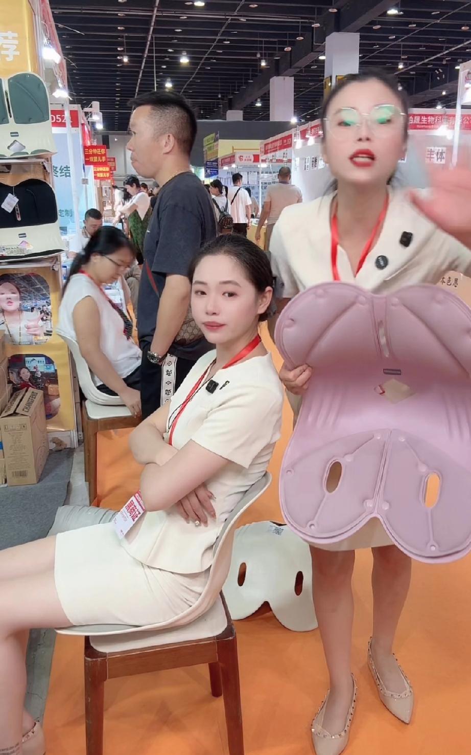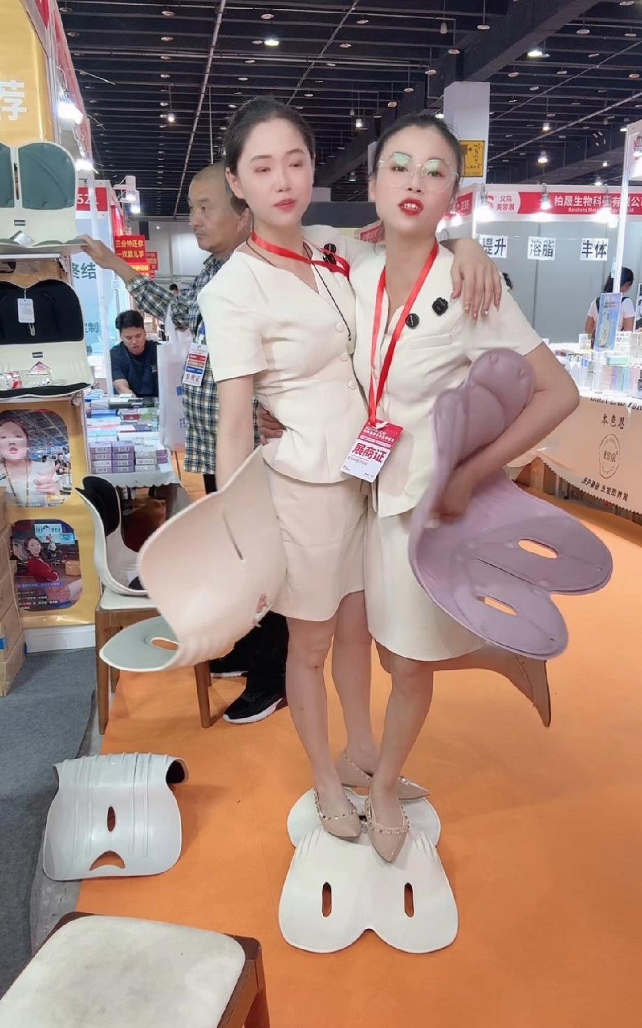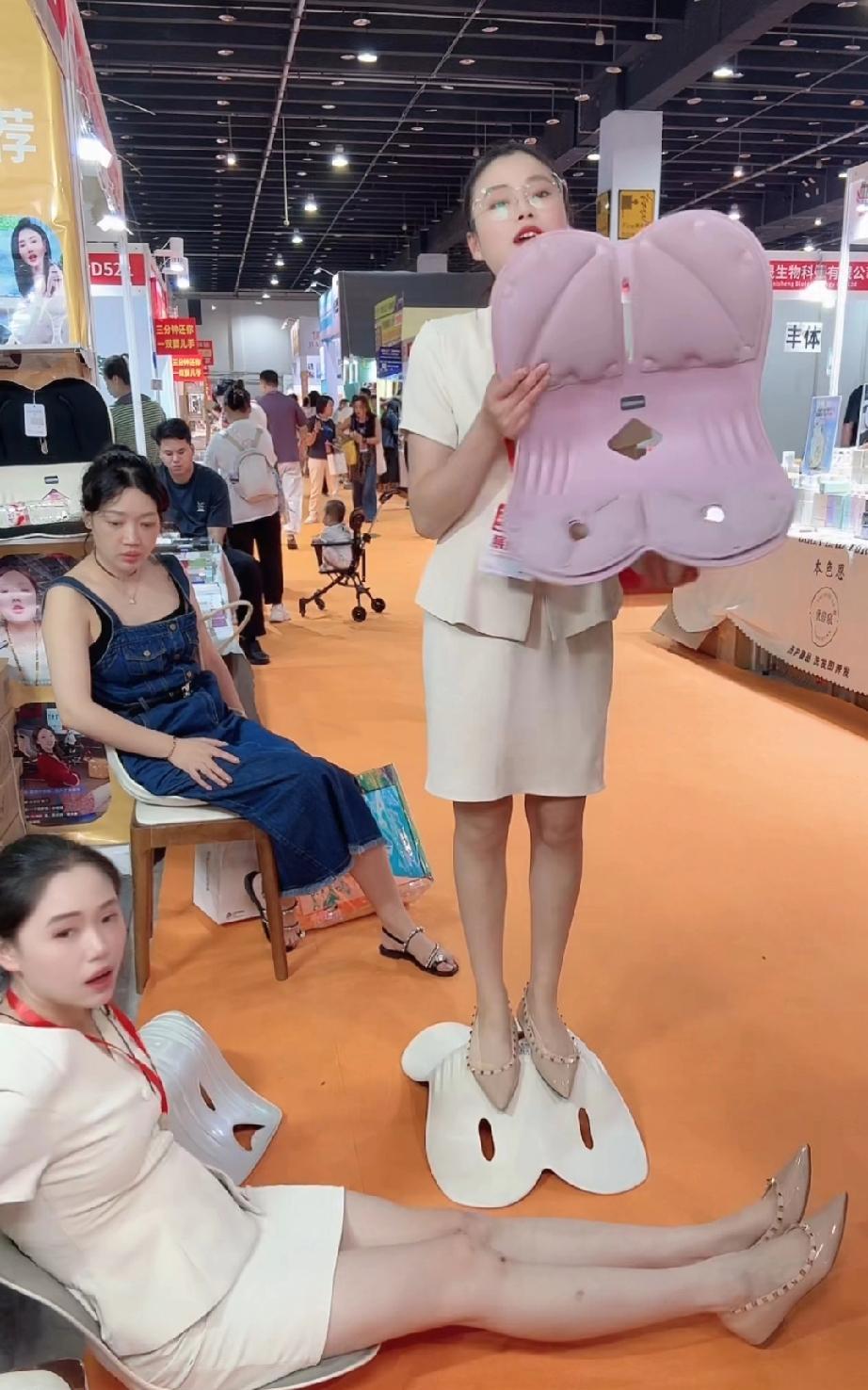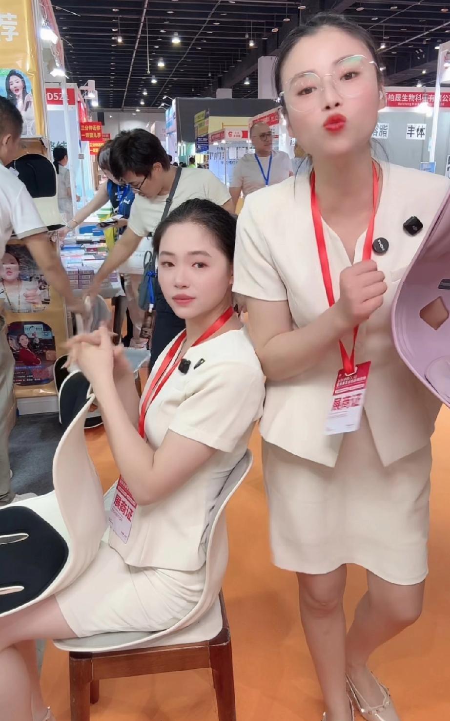 展会上的两个姑娘,推销实在不容易,佩服! 之前买过人工力学的靠背,当然,图便宜,