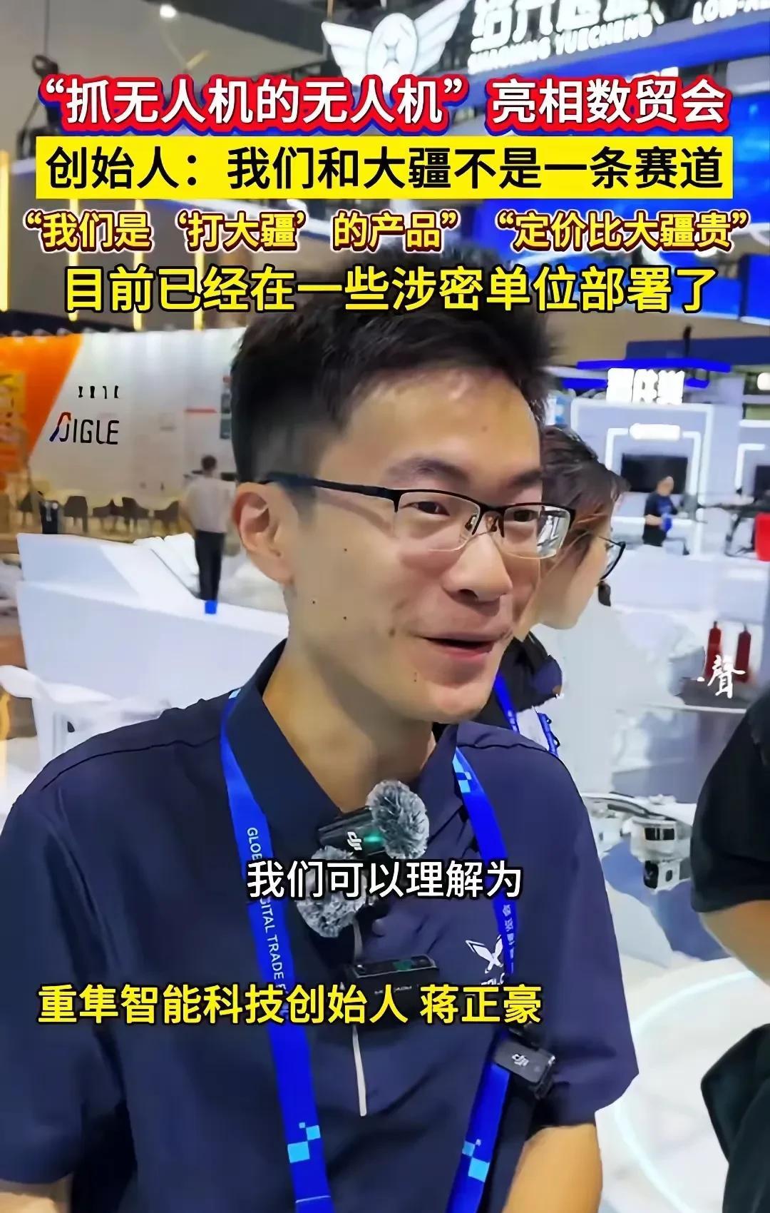 这项技术直接让对手的无人机成了自己手中的玩具了,重隼科技的创始人蒋正豪真是太牛逼了! 你研发无人机,我就研发专门抓补无人机的无人机,什么意思?就是你放飞的无人机成了我抓捕的对象,类似警察抓小偷一样,而且这项技术已经在一些涉密单位部署了。太厉害了! 现在好不夸张的说,在无人机这个领域我们绝对是一骑红尘,拿着望远镜都看不到对手了,刚刚展现出来的激光武器是专打无人机的,现在又来了一个专门抓捕无人机的无人机,这简直是让对手根本不敢露头了。更让人想不到的是这个小年轻刚刚大学毕业,2002年出生的而且他们公司刚刚成立一年时间,太了不起了![赞][赞][赞] 现在我们的科技很活不但用井喷来形容而且是一浪更比一浪强啊!