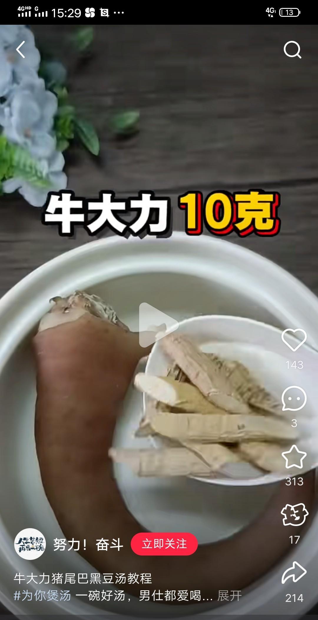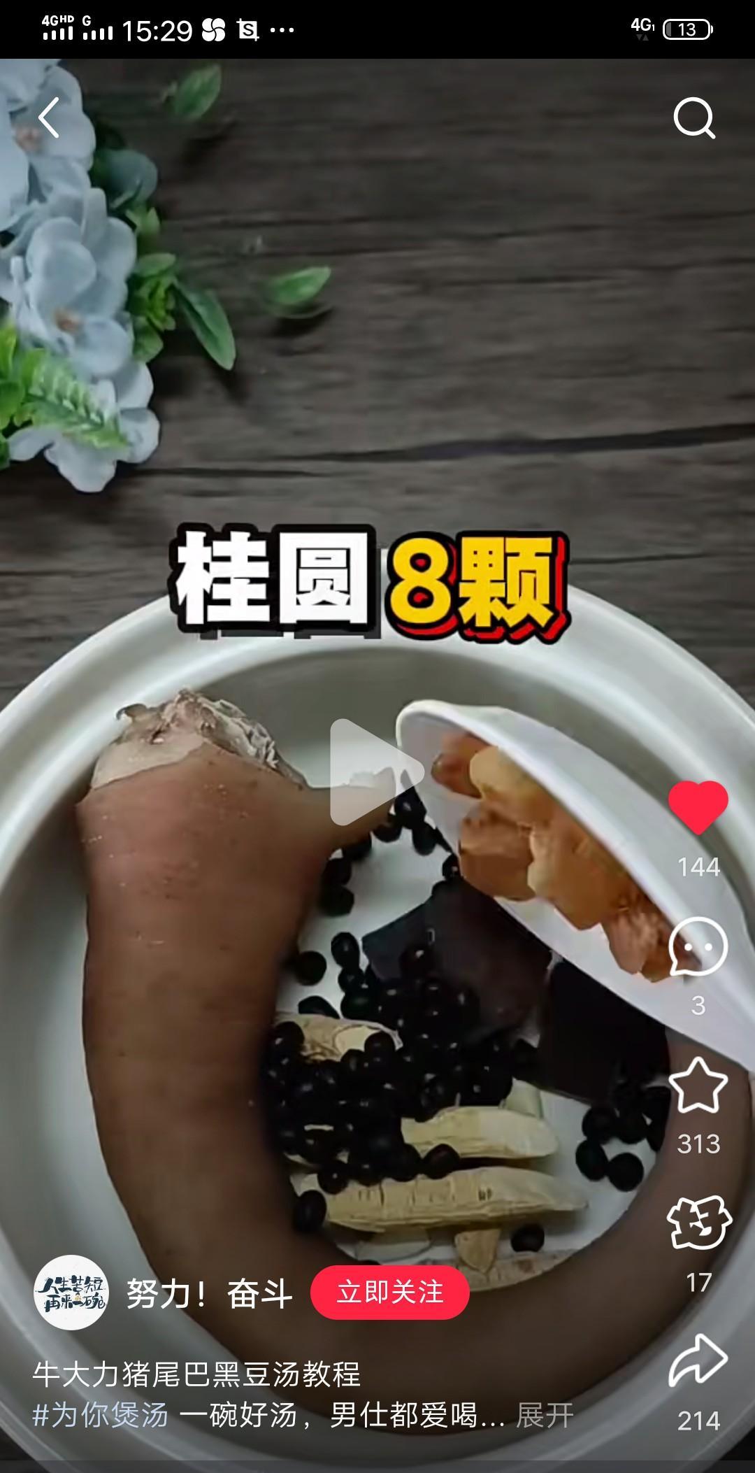 一碗好汤,男子都爱喝 找一条猪尾巴,牛大力10克,黑豆10克,桂圆8颗,杜仲8克,加水煮一小时,晾凉喝即可。