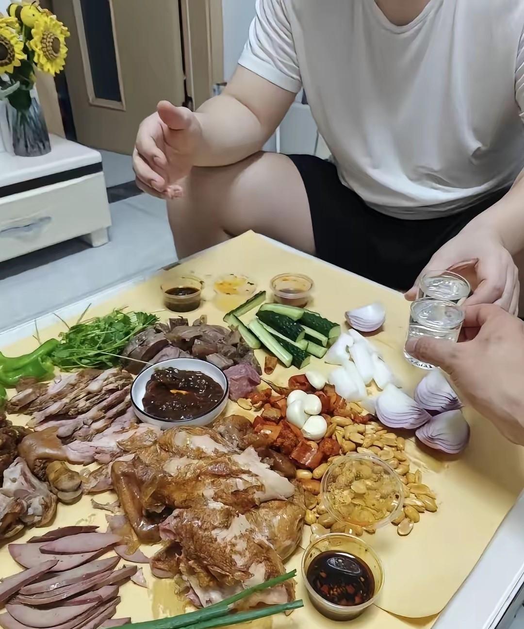 这一看就是家里没女人 两个男人, 难得聚在一起, 不想把时间花在厨房里, 买点现成的, 回来找张纸往茶几上一铺, 买来的凉菜往纸上一倒, 就开喝了。 说不定纸都是包卤菜的纸, 拿回来一散开就能吃了。 吃完团成一团, 往垃圾桶一丢, 既不需要刷盘子, 也不需要刷碗。 时间都用来侃大山, 没有比这更爽的了。