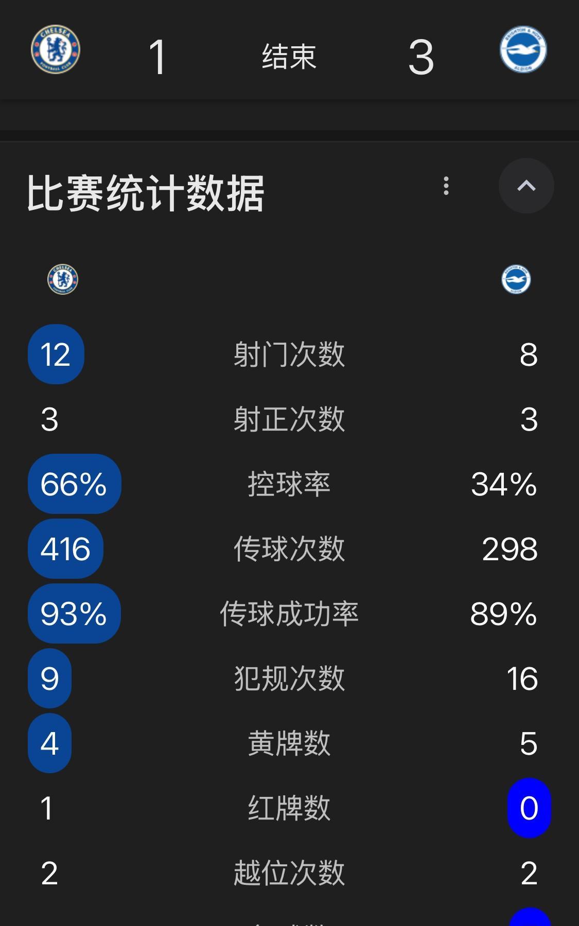 英超赛事: 第六轮,切尔西切对阵布莱顿 正义会迟到,但正义一定会到! 脚抬那么高踢到头了,居然没有红牌和点球?太黑了吧? 好在,布莱顿并没有被黑,随后完成了绝杀,并最终以3比1逆转了切尔西,送给蓝军二连败! 切尔西连续两场比赛有红牌,一场输给曼联,一场输给布莱顿。 十人作战一定会输?其实不必,切尔西主教练马雷斯卡的排兵布阵,只想到两个字,【窝囊】,真的太窝囊了,当年穆里尼奥那支铁血蓝军,到底去了哪里? 西汉姆的波特也下课了。 第三位下课的英超主教练,会不会不是阿莫林,而是马雷斯卡?