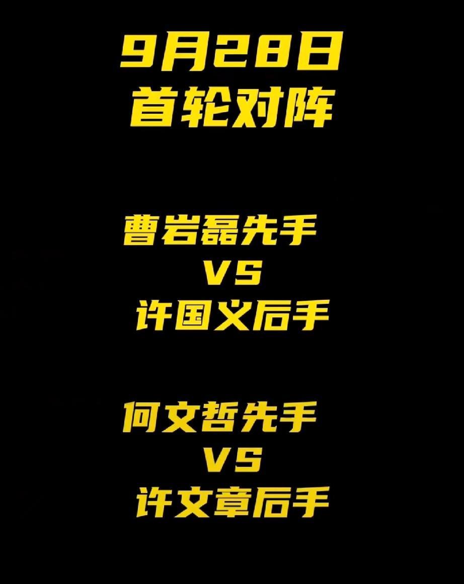 2025中秋国庆杜康杯来了,曹岩磊1号,何文哲2号,许文章3号,许国义4号! 第一轮对阵: 曹岩磊对许国义(1对4) 何文哲对许文章(2对3) 曹岩磊实力应该稳居第一!谁能拿第二?许文章说了算,他小宇宙爆发,也是非常厉害,翻车也是常有的事,这种比赛,一般是快棋,许文章基本功扎实,应该会有好的发挥,慢棋老中套路,许文章快棋也不错,何文哲刚下完上海杯,连番作战会不会舟车劳顿? 好像是今天开战,所有棋手,加油!