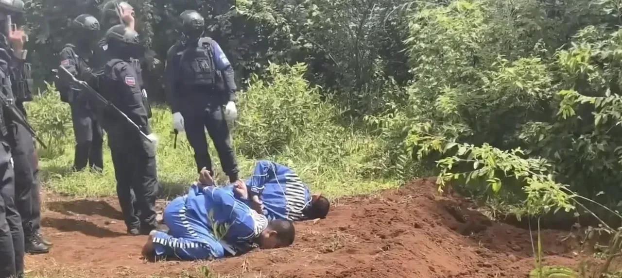 近日果敢同盟军在木邦县召开了一场公判大会,7名犯罪分子站在台上接受特区政府审判。台下几千名观众观看,场面十分热闹,大会结束后两死刑犯被押往刑场执行枪毙。 缅甸第一特区木邦县政府、果敢同盟军的执法简单直接。死刑犯被五花大绑押到刑场,手脚都用绳子绑住,想逃跑根本就不可能。 第一特区的刑场看着有点吓人,就是在山脚下一片开阔地上挖几个1米多深的土坑。犯人被拉到土坑边跪着,枪手用枪指着犯人脑袋,上边领导一声令下,枪手直接一枪爆头。 随后犯人便倒在土坑边上,枪手一脚把尸体踢进坑中,然后朝坑中填土掩埋犯人尸体,简单又快速地处理好现场走人。 这种场面虽然简单粗暴,但是很吓人的,看看两个犯人一到土坑边上早吓软了。连头都不敢抬起来,身体是半跪半躺在地上,几个土坑就在他们面前,那就是他们最后的归宿,相信他们已经很后悔了吧! 这种场面对犯罪分子有很大的威慑力,让他们不敢再轻易去犯罪。那是要付出代价滴!不过,有一点我看着好奇怪,犯人为什么穿着囚服上路呢?他们没有自己的便服换上吗?