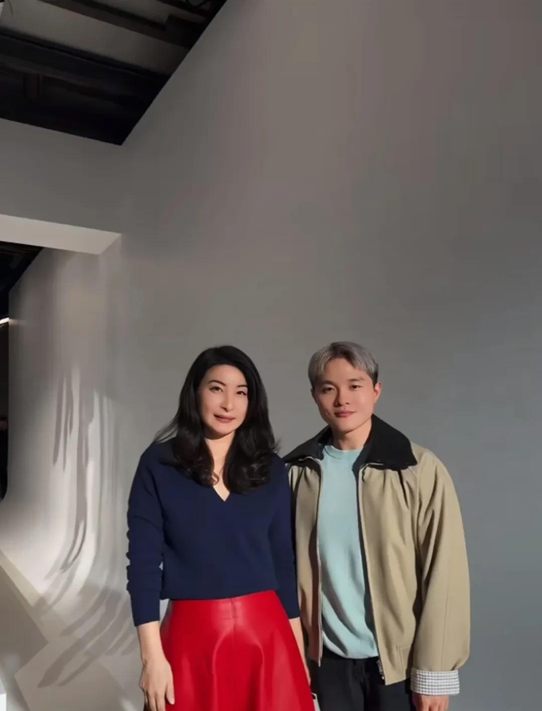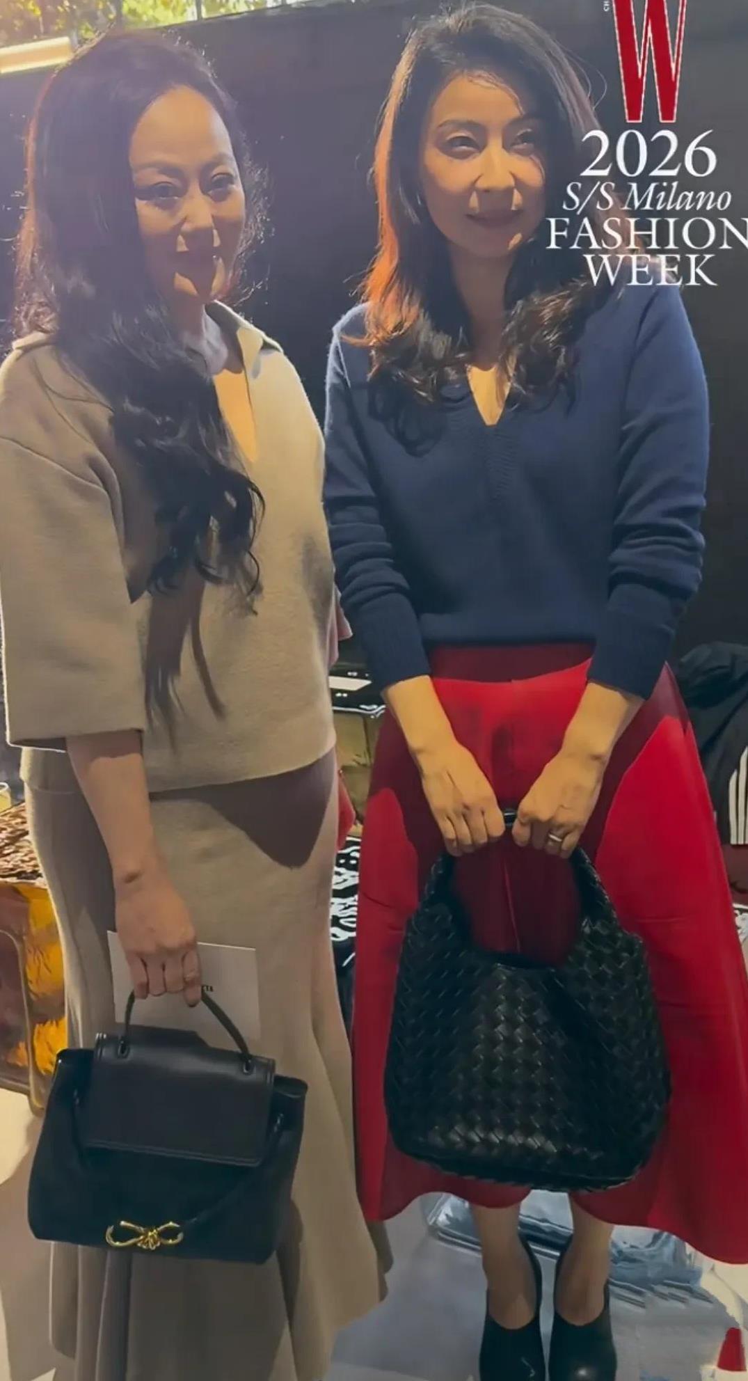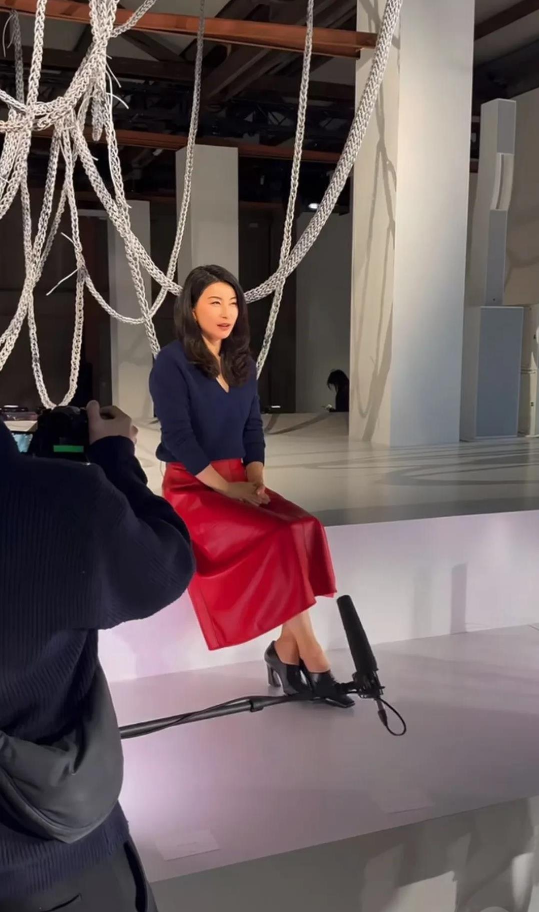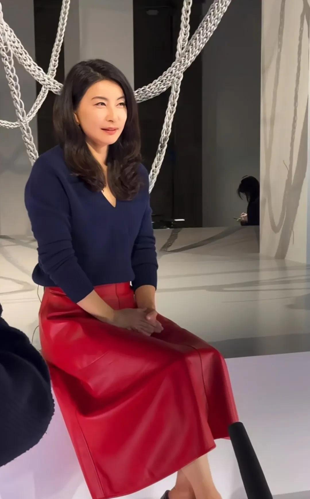 跳水皇后郭晶晶现身米兰时装周,她一头蓬松的波浪卷,身穿蓝色v领针织衫,大红色皮裙