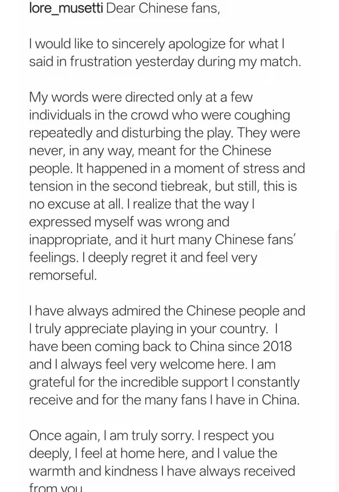 穆塞蒂道歉了! 其实在比赛过程中,当他嘟囔出那句“极不友好的”言论,就有懂意大利语的网友,提醒了中国球迷。 他并未第一时间道歉,而是舆情发酵之后,不得已而为之。 与之前在深圳抱怨中国食物那名美国黑人选手如出一辙。 穆塞蒂为自己的言论进行了辩解,他表示自己只是针对观众席几个不停咳嗽、扰乱秩序的人,这些话绝对不是针对中国球迷的。 当时,比赛进行到第二盘抢七的关键时刻,他表示这绝非借口,已经意识到自己表达方式的错误,伤害了中国球迷,对此深表歉意。 对于他的道歉,你会接受吗?