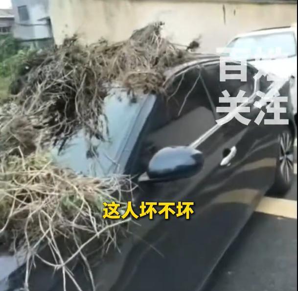 车上一些干草树枝像是摆放的,车辆没有污水留下痕迹,摆拍无疑