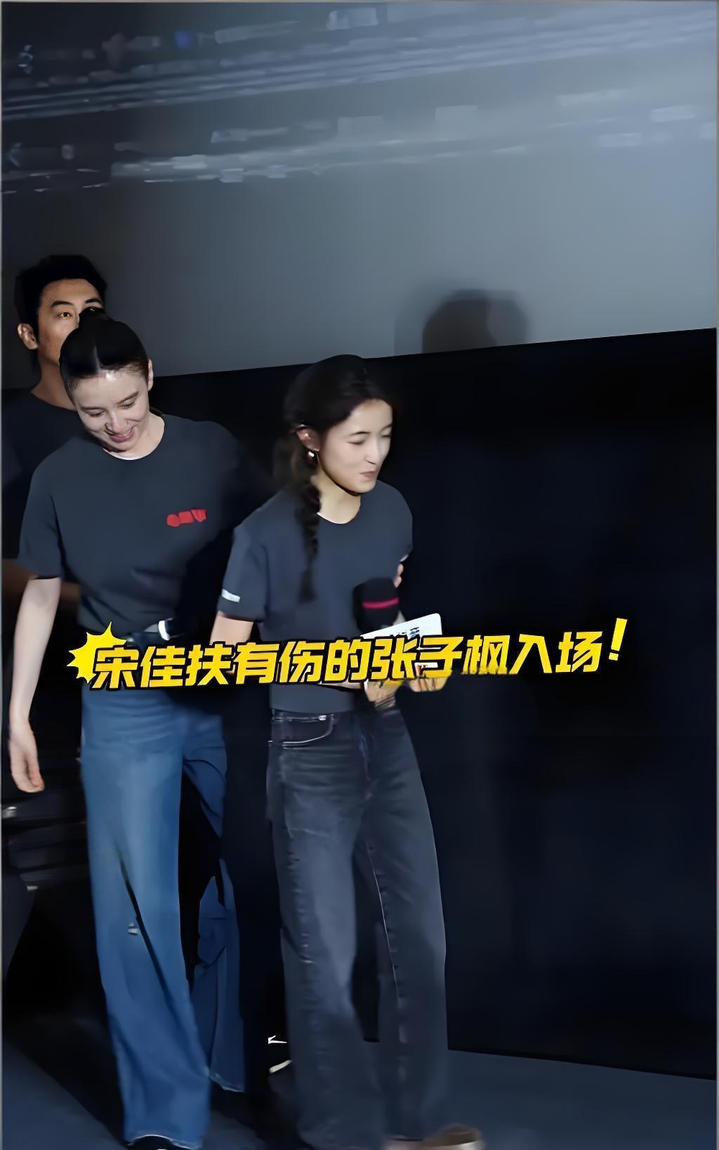 近日活动现场,张子枫因腿伤行动不便,走路时略显吃力。一旁的宋佳见状,立刻上前,轻