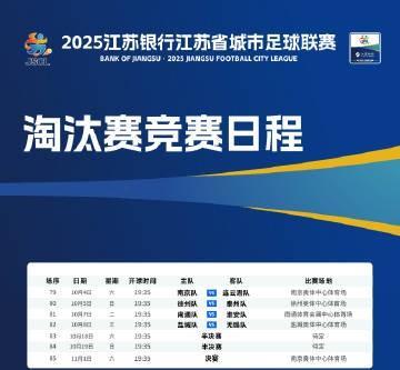 国庆假期苏超看个够 9月27日,“苏超”常规赛正式收官,经过激烈竞逐,南通队、南京队、徐州队、盐城队、无锡队、泰州队、连云港队、淮安队等八只队伍成功晋级淘汰赛。据江苏省城市足球联赛官方最新消息,淘汰赛竞赛日程正式公布,其中决赛场地确定为南京奥体中心体育场。