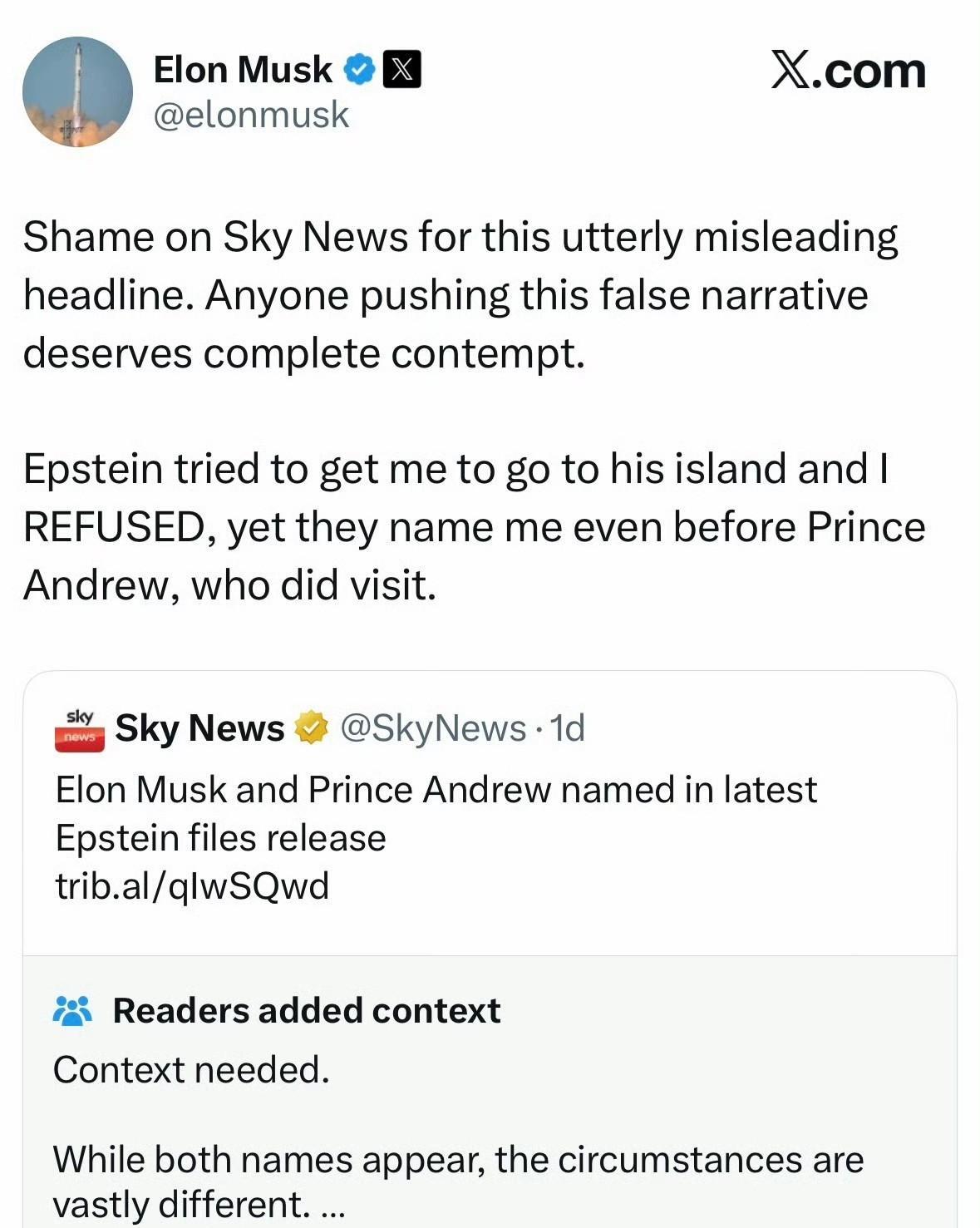 大左媒英国天空新闻《埃隆·马斯克和安德鲁王子被点名出现在最新曝光的爱泼斯坦档案中》。 马斯克回应:“天空新闻真丢人,竟然打出这种极具误导性的标题。任何推动这种虚假叙事的人都该受到彻底的鄙视。” “爱泼斯坦曾试图让我去他的岛上,我拒绝了,可他们居然在安德鲁王子之前先点了我的名,而安德鲁王子是真去过的。” 天空新闻关闭了此条内容的评论区。