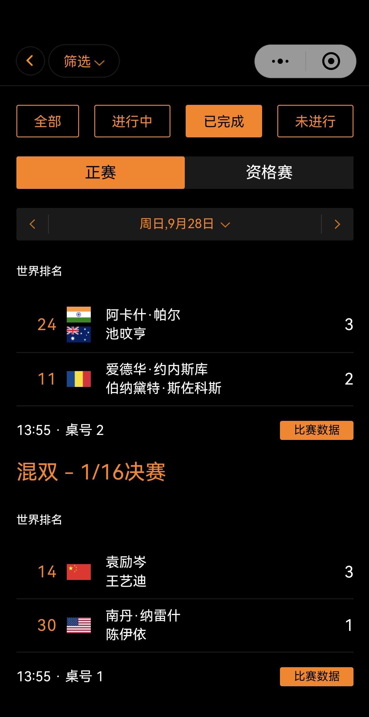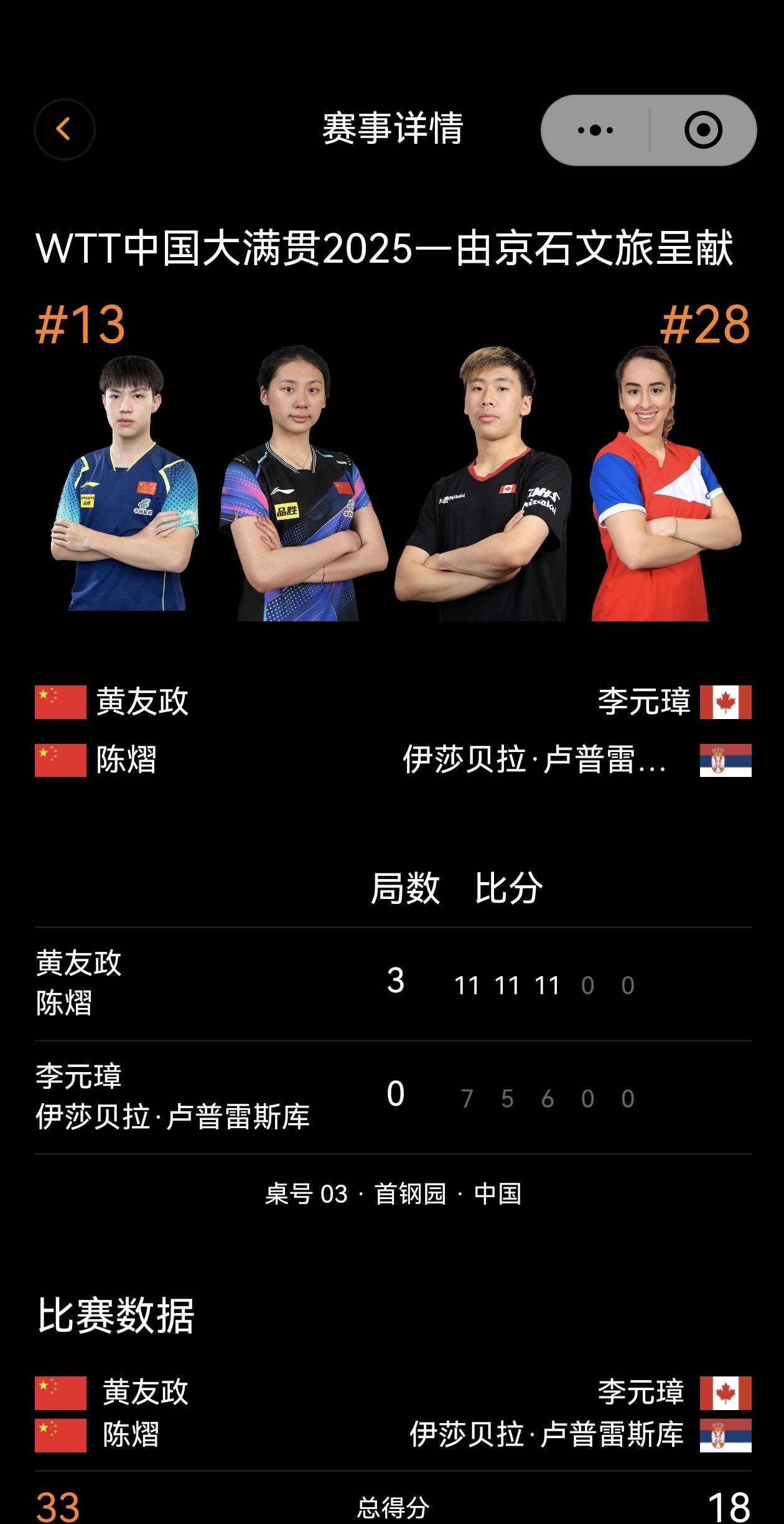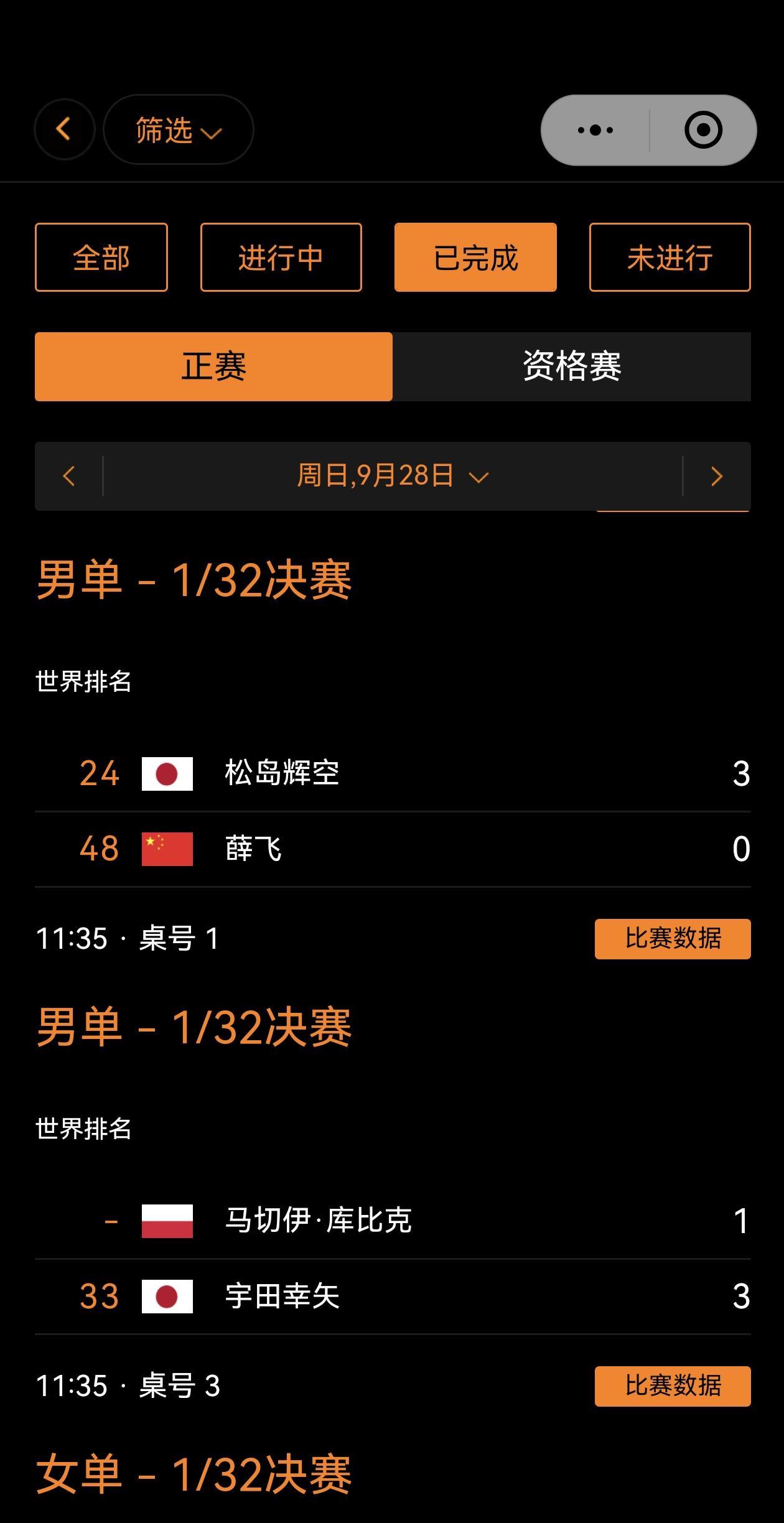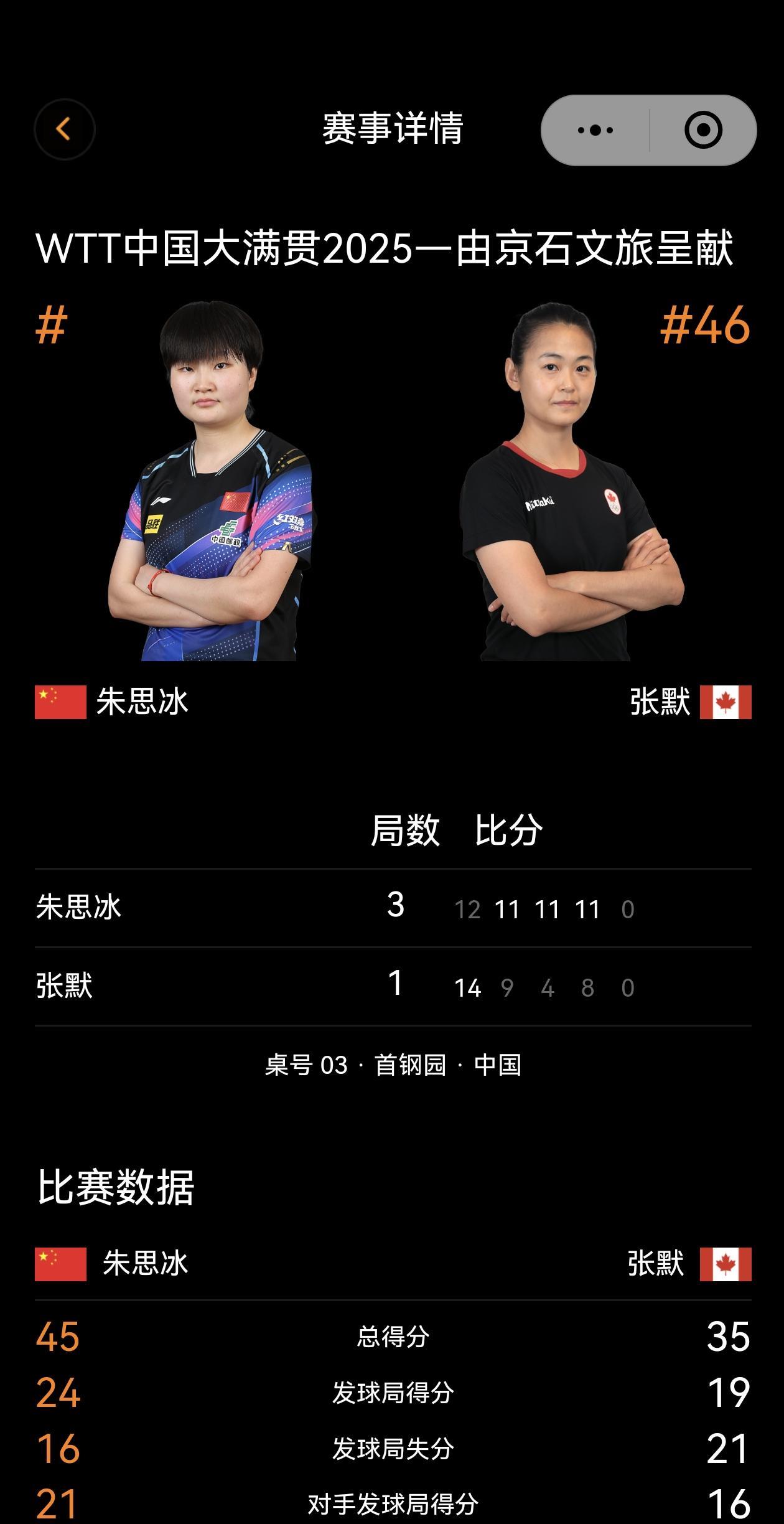 WTT北京大满贯2025,9.28正赛第一天午场:孙颖莎3:1平野美宇,周启豪零