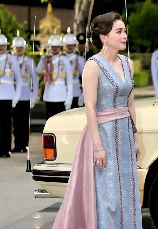 那件淡蓝裙子,不是随便穿的。 是泰国传统织法Mudmee,120小时一针一线缝出来的。 颜色选对了——星期一,国王的生日色。 深V? 王室女人头一回这么露。 没人敢说,但人人都在看:她敢,她就赢了。 她不是来当花瓶的。 前脚刚在医院摸过护士的手,后脚就去给血站奠基。 腰细了五厘米,不是节食,是泰拳加普拉提,天天练。 王室不缺钱,缺的是人味儿。 她把王冠戴在肩上,没压住肩膀,反而让人觉得,她能扛事。 国王牵她手,不是作秀。 是告诉全国:这个女人,能替我接住风浪。 大选后骂声没停,王室被推到风口浪尖。 她穿泰丝,说泰语,走基层,不靠头衔,靠脚步。 没人逼她这么做,但她做了。 她不是王后。 她是王室里,第一个敢把“亲民”两个字,穿成衣服的人。