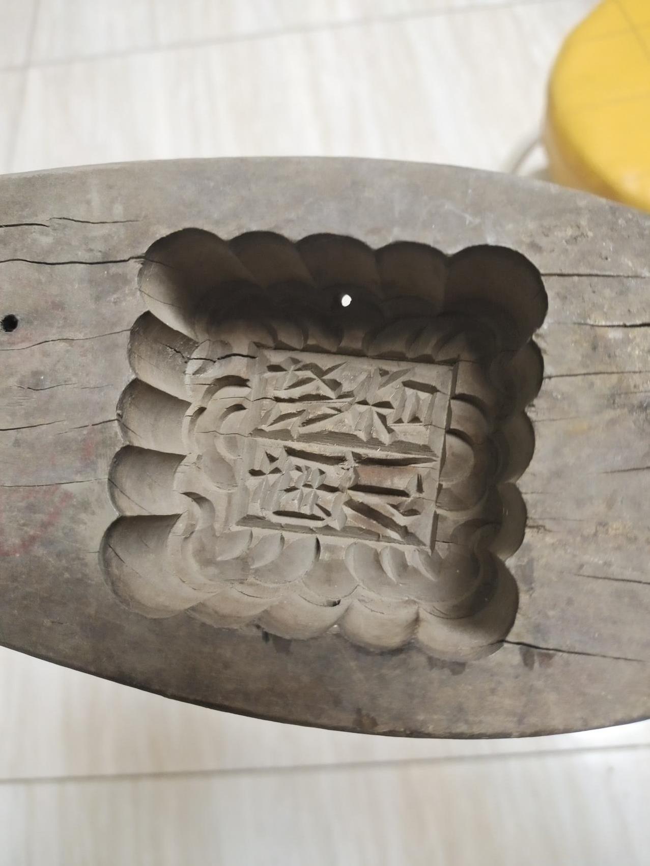 在外面拣到一件“古董”——做月饼的木头模具,模具方坑里有“南瓜奶香”4个字。