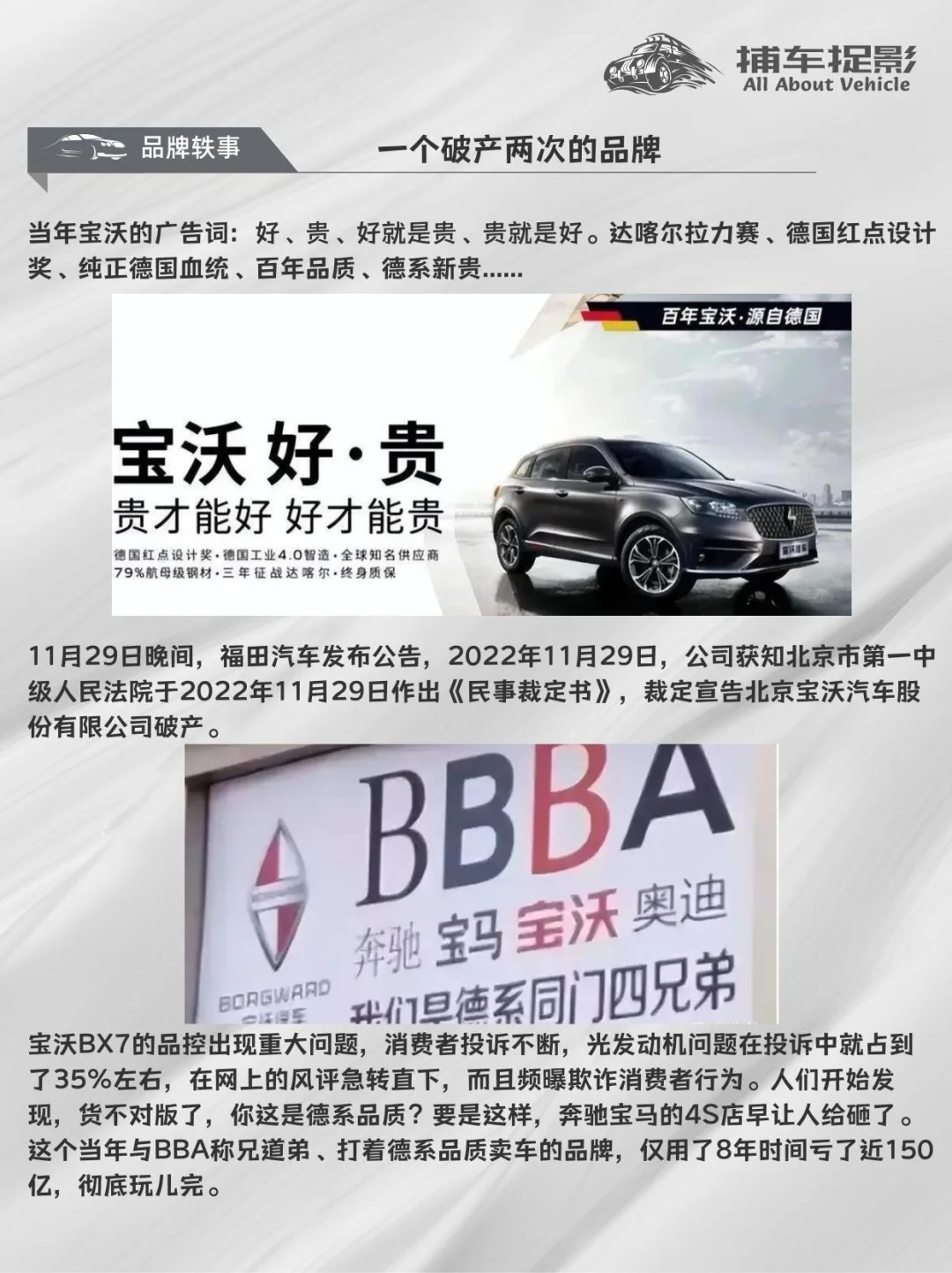 宝沃BX7的品控出现重大问题,消费者投诉不断,光发动机问题在投诉中就占到了35%左右,在网上的风评急转直下,而且频曝欺诈消费者行为。人们开始发现,货不对版了,你这是德系品质?要是这样,奔驰宝马的4S店早让人给砸了。这个当年与BBA称兄道弟、打着德系品质卖车的品牌,仅用了8年时间亏了近150亿,彻底玩儿完。