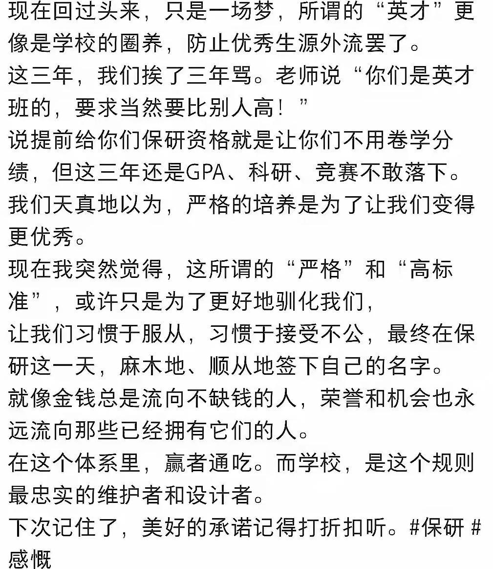 “院士班”实为招生筹码,所谓院士引领多挂名无实导。正常,院士那么忙,怎么会有时间?即使普通班的班主任也形同虚设,起不来什么作用,大家都很忙。开学期末见一面已经是不错了,班主任几乎班上一个学生也不认识,招生噱头,别当真! “专业任选”实为画地为牢,热门方向需二次厮杀。正常,规模小有可能,人多了,200人以上的专业任选?怎么可能!都去热门专业热门专业也接纳不了。别太当真,很多大学只是作为招生手段,怎么可能兑现? “一生一策”沦为空洞口号,培养方案年年变。培养方案年年变,正常!与时俱进!一生一策?那么多人,怎么可能!研究生做到都难哦。专属导师,学生少,有可能。本科生导师也形同虚设,很多本科生导师,问问你家娃,相互都不一定认识。 招生承诺,别太当真!提前保研=提前套牢,失去跨校选择权; 资源倾斜越狠,内部绞杀越凶,普通班越没有机会。