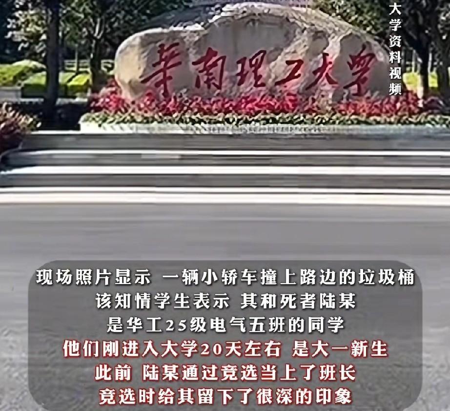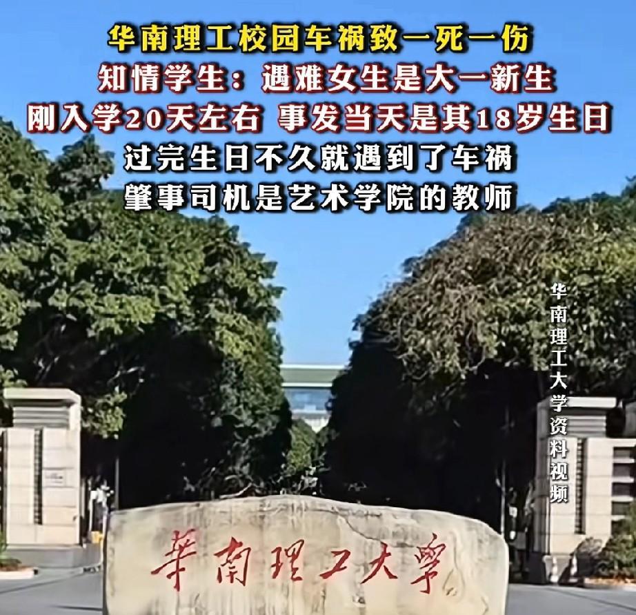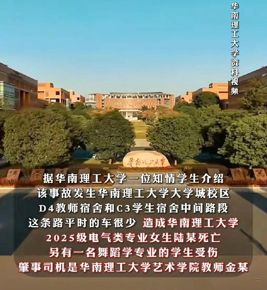 华南理工1死1伤车祸,死亡女生是大一新生,还是班长,当天刚过完18岁生日,下楼扔垃圾时出事,离宿舍只有100米。伤者是她的同学,应该也是去参加生日聚会的,没有大碍已出院。司机是学校艺术学院的教师,不知为何在校园内部道路会发生如此惨烈的车祸? 先看警方通报,事情发生在9月27日的夜晚9点多,具体地点是广州番禺的小谷围岛上,那里俗称“大学城”,有很多大学聚集,学生、教师非常多,通报中也明确提到了是内部道路。 肇事司机名叫金某,开车撞人致1死1伤,群众报警后,警察将金某控制! 随着知情学生的爆料,越来越多的事件细节开始浮出水面: 死亡女学生名叫陆某,18岁,华南理工大一新生,当天恰好是她生日,没想到晚上在宿舍庆祝完后下楼扔垃圾,便惨遭不测,生命永远定格在成人礼这一天。 事发地点有一处垃圾站,都是学生们扔垃圾的地方,离陆某宿舍只有100米。这么近的距离,又是校园的内部道路,谁都想不到会有这样的无妄之灾。 据传陆某是广西贵港的,今年以600多分考入名校,也不知是真是假。但她在大学的确很优秀,主动竞选成功当上班长,性格很好、开朗大方,同学们对她印象很好很不错,对此事非常惋惜。 受伤的女生是学舞蹈的,幸亏没什么大碍,她家长说她是去看同学,估计是参加完聚会后陪着去扔垃圾。金某是艺术学院教师,那应该就是学舞蹈女生的学院了。 从网传的事故图片看,一辆小汽车冲上了路边的垃圾站,目击者还听到了一声巨响。事发地是内部道路,不算太宽,仅能两车通行,平时车不多,也不知金某是怎么开车的,希望早日查清,给家属一个交代! 俗话说:儿女生日、娘的苦日,这是让人铭记母亲分娩的苦痛和伟大。母亲永远忘不掉女儿生日,可陆某却在18岁生日这么特殊的时间被撞身亡,留给妈妈的,或是永远无法愈合的痛…… 【关注@小讼言案 ,为您分享更多精彩】 (来源:澎湃新闻)