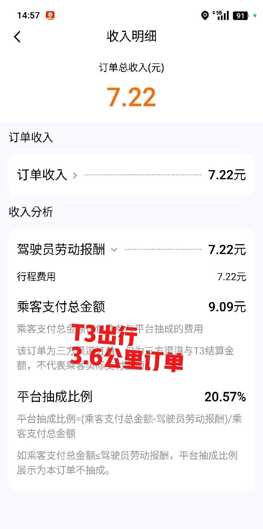 跑3公里只赚7块,T3司机怎么活? 3.6公里,7块2,油费都不够。 乘客掏9块,平台抽走1块8,20%的刀口明晃晃。 有人把账算到每公里2元,说比公交便宜,可公交司机有五险一金,有固定班次,不用空跑十公里等下一单。 小城市订单稀,司机怕拒单被降权,只能咬牙接。 平台把补贴砍掉,把奖励门槛抬高,司机成了广告牌,还自带油钱。 数据摆在这,不是司机喊穷,是跑一天下来钱包真的没鼓。 想多赚,就得熬14小时,腰和刹车片一起报废。 有人提议涨价,可一涨价乘客就回流出租,平台更不敢动。 死结里唯一松动的螺丝是司机的命。 别光吐槽,把截图甩给客服,打12345也要留记录,声音多了,规则才可能松一条缝。 跑车是饭碗,不是慈善,别让老实人独自扛成本。 7块2不是底价,是警钟,再装睡就真没油了。