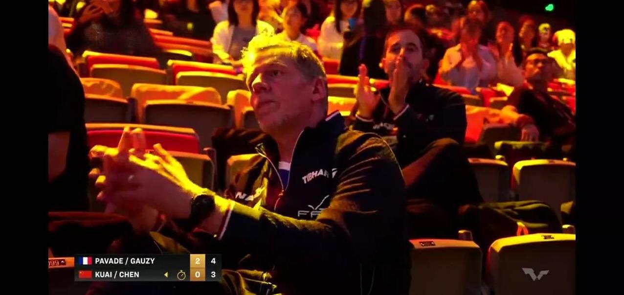 蒯曼陈垣宇有惊无险的让二追三战胜了法国的高茨帕瓦德,前两局蒯陈配合不咋样,尤其是陈垣宇关键时刻拉风,两局都是9:9只后输的关键球,好在又连赢两局,决胜局又出现了比分9:9,这次关键分抓住了,赢了比赛,比赛时镜头给到了观赛席上的邱贻可孙逊,还有德国队的教练都来看比赛了。