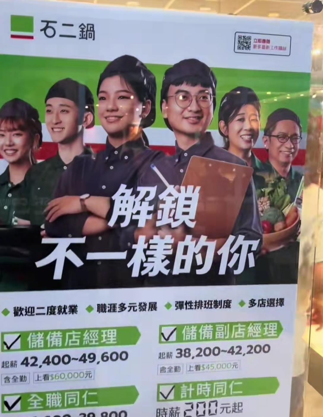 台湾餐饮服务员薪资待遇 台湾网友“台湾阿青”在台湾的屏东的一个商场拍摄的餐饮店的薪资。 第一家服务员最低是34700元新台币,月休8-10天(其实就是双休,有时候一个月是四个星期+周六日),按照今天(9月15日)人民币兑换台币4.2555的汇率,就是8154.5元人民币。而且餐厅包吃,但没写包住。 第二家服务员最低是36600元新台币,没有说是否双休,但大概率是,折合人民币8601元, 基本上是不包吃住,但是工资高过我们不少, 看来我们的工资还有很大上升区间。