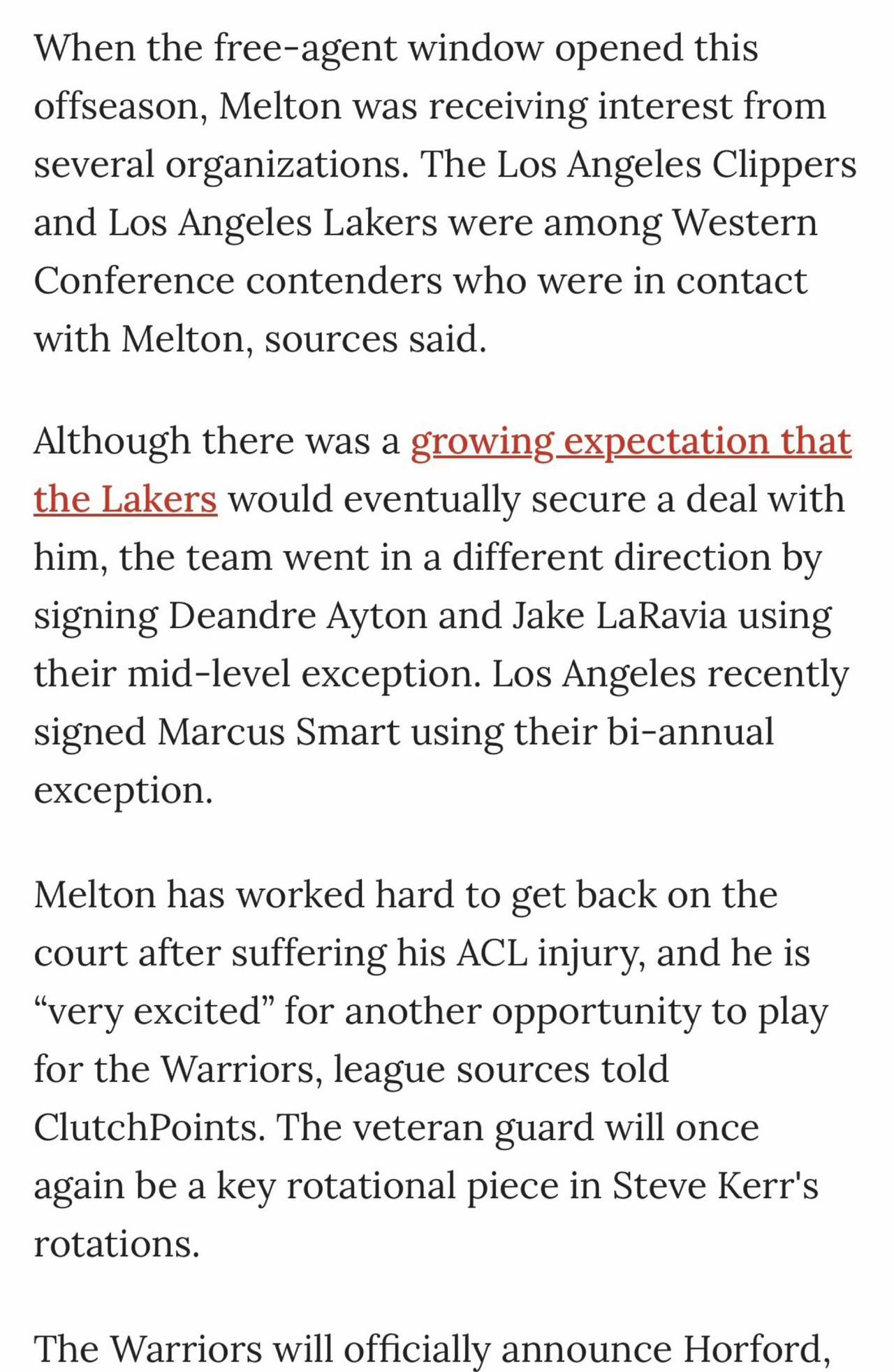 Brett Siegel:今年休赛期自由市场开启后,梅尔顿收到了多家球队的兴趣。消息人士透露,快船和湖人等西部劲旅均与梅尔顿有过接触。 尽管外界普遍预期湖人最终会签下梅尔顿,但球队却选择了不同的方向,用中产特例签下艾顿和拉拉维亚,之后用双年特例签下了斯玛特。 消息人士透露,梅尔顿在遭遇前交叉韧带伤势后努力恢复,如今他“非常兴奋”能再次为勇士效力,将再次成为科尔轮换阵容中的关键一员。勇士将在库明加的合同问题解决后,正式宣布霍福德、梅尔顿及其他新援的签约。