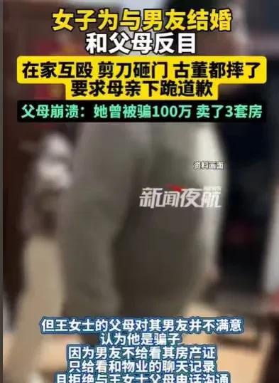 河南郑州,31岁女子,想找高富帅,被骗了100万,卖了3套房,但她还没有醒悟过来,又谈了一个25岁的男朋友,3个月就花了二十几万,现在怀孕了,她又要给男友30万嫁妆,男友说会给她60万彩礼,女子父母怀疑这是骗婚,就不再给钱,结果女子和母亲互殴,她还剪刀砸门,摔古董,还说要母亲向她下跪道歉。 王女士怀孕了,她高兴地将这个消息告诉男朋友,男朋友就和她谈婚论嫁,让她先给30万嫁妆,然后他会再转60万彩礼。 一看男友要和她结婚了,她终于找到帅帅的,坏坏的丈夫了,她兴奋地回家,她要将这个好消息告诉父母,让他们给30万。 可这一次,父母却一眼看出,自己的女儿可能又遭遇了骗婚,他们这一次说什么也不再拿钱出来。 说起王女士的事情,她的父母真的是太操心了,王女士就是一个恋爱脑,还公主病,从小被惯坏了,以至于现在,还想找比自己小6岁的男朋友,她还以为自己找到了高富帅。 他们女儿所做的事情,没有一样是让他们放心的。 就在半年前,王女士就被骗了100万,都是在找高富帅的路上,被别人给骗走的,为此她卖了3套房子,现在都变成穷光蛋了,她还是没有醒悟,既然还要找那种帅帅的,坏坏的男朋友。 现在谈的这个男朋友,也才半年时间,就花了30万,因为恋爱三个月,她就给对方买了一辆20多万的车。 现在怀孕了,没钱了,又回来问父母要钱了,这一次要的竟然是30万,她要这30万做嫁妆。 父母一听,当然觉得这事情不对劲,哪里有先给嫁妆,然后再给彩礼的,更何况王女士父母连男方的父母都没有见过。 一开始的时候,王女士一回家看到父母污蔑自己的男友是骗婚,她就气得说要让母亲下跪跟她道歉。 一家三口,因为这30万的嫁妆,王女士和母亲互殴了起来,她和母亲互殴之后,两人身上满是伤,王女士见目的还没有达到,又拿起剪刀一直砸门。 她还将父母珍藏的古董拿了出来,摔碎了,看着自己娇生惯养31年的女儿,竟然变得如此不可理喻,王女士的父母才意识到他们惯子如杀子。 可现在能怎么办呢,女儿已经长大,她终究是要嫁人的,但现在她要嫁的这个男朋友,实在难以让做父母的放心。 父母和王女士沟通不了,他们看着女儿撒泼打滚,在家大喊大叫,非得父母给钱,她要拿这30万给男友,跟男友出国,去跟国外婆婆一起生活。 父母看着女儿已经无法沟通了,他们只好了找来了调解员。 面对调解员的到来,王女士的父母非常无奈,他们说他们今年已经给了70多万给女儿了,女儿都花在找男朋友的路上,现在他们的女儿明显是被骗了,可女儿却没有醒悟过来。 王女士一看父母又在污蔑他的男友是骗婚,气得当着调解员的面,又大喊大叫起来,她跟调解员说,像她这样嗲嗲的女孩,要让她跟父母介绍的电工结婚,那是不可能的,电工配不上她,她就喜欢那种坏坏的,看起来像大哥一样的,在外一看就像坏人,能够保护她的男朋友。 看着这个迷途不知返的女孩,看着她对着父母大喊大叫,调解员也是当面指责她,做人要有良心,不要吃着父母的饭,花着父母的钱,还要骂父母。 后来在调解员的帮助下,王女士的父母允许王女士一个人出国,和她婆婆生活,但是不能带嫁妆和一分钱。 或许父母也想通了,他们不可能保护女儿一辈子,也是时候让女儿出去吃吃苦头,方能理解做父母的一片苦心。 那么怎么看待王女士遇到的这件事呢? 其实王女士的男朋友挺可疑的,王女士和他谈婚论嫁,他不但让王女士先给30万,再转60万彩礼,他更是没有安排自己的父母和王女士的父母见面,王女士的父母打语音给他,他也不接,打给他的父母同样也不接,这真的很可疑。 其次,王女士的父母太过于溺爱王女士,导致她不懂感恩,还打父母,骂父母,这些都不利于家风建设。 《民法典》第1043条规定:家庭应当树立优良家风,弘扬家庭美德,重视家庭文明建设。 作为父母,从小就应该教子女独立,有辨别是非能力,子女长大之后才不会被骗。