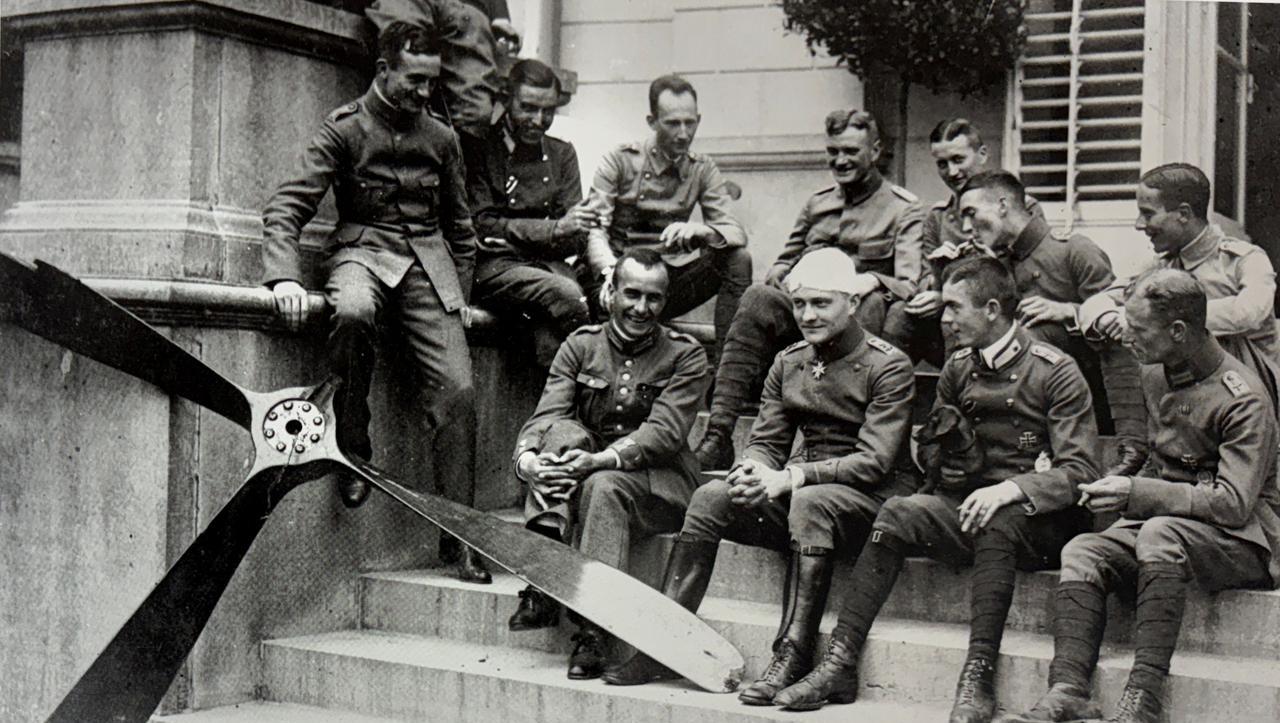 1917年8月14日德军第1战斗机中队飞行员带着英国飞机的螺旋桨作为礼物看望住院的中队长里希特霍芬,他7月6日与英军第20中队空战中头部受重伤