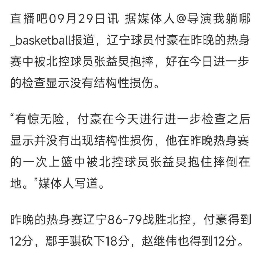 付豪被抱摔到地,检查结果出炉! 在刚刚结束的辽宁男篮邀请赛第三场对阵北控的比赛,