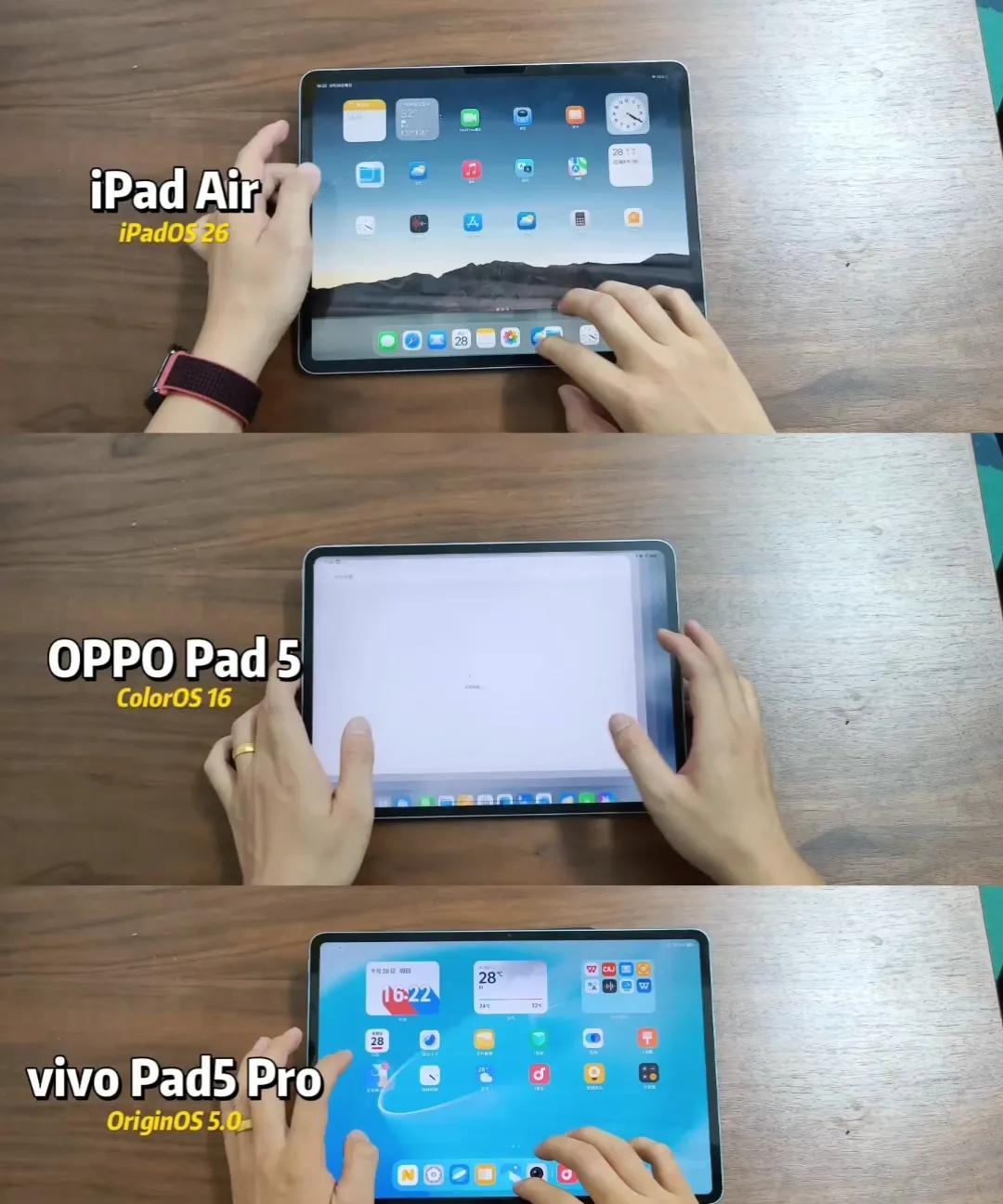 苹果的系统是公认的打磨得很精致的,各方面系统动画都有适配,视觉效果很流畅 但现在安卓系统也越来越好了,像vivo这款做了简单的模糊处理,流畅度很不错。 OPPO Pad 5也是,不比苹果差,而且细节还很丰富,像这个横竖屏旋转切换的过程,桌面图标都专门做了位移动画。 连续打开应用时的打断动画也是,苹果和OPPO过渡都很顺畅,OPPO看起来还更跟手一些。 小窗多开应用这方面就比较看性能了,vivo能稳得住,还能直接挂3个后台。苹果的M3芯片自然没得说,小窗模式跟电脑很像。OPPO Pad 5能先全景虚拟屏开3个app,小窗再挂着3个,流畅度也没影响,ColorOS 16是真有点东西的 大家觉得,这三款平板谁更丝滑? #iPad# #平板电脑# #OPPO平板# #OPPOPad5# #ColorOS16# #vivoPad5Pro# #数码科技# #OPPO丝滑板王来了#