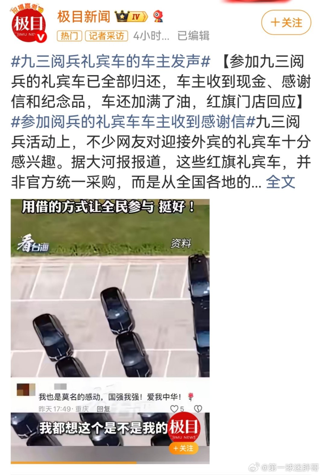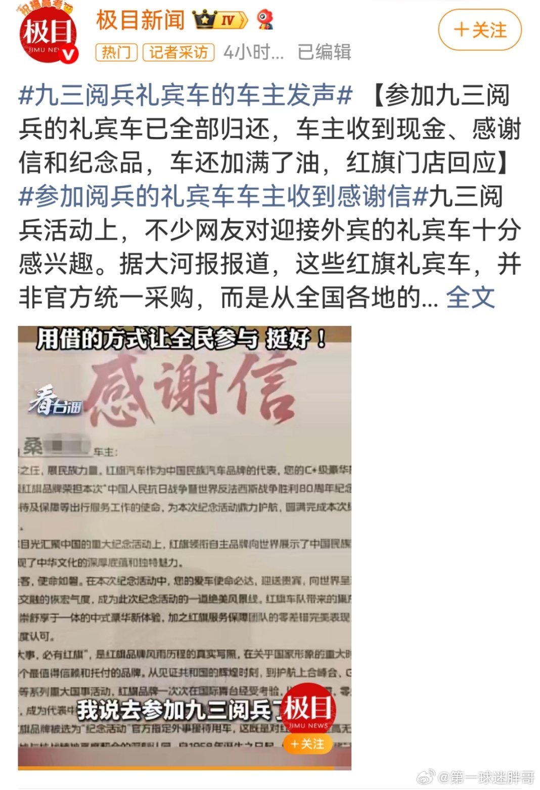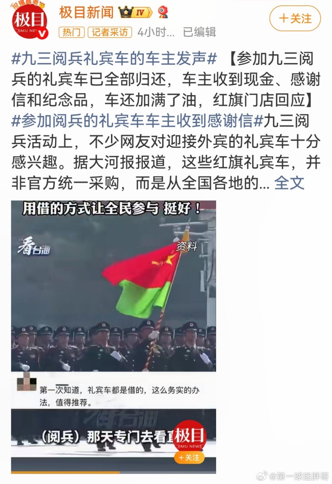 参加阅兵式的礼宾车归还时加满油 参加九三阅兵的礼宾车在归还车主时确实加满了油,并配套提供了全车检查、现金补助、感谢信和纪念品。这一做法体现了对车主支持的尊重与感谢,也赢得了车主和公众的积极反响。