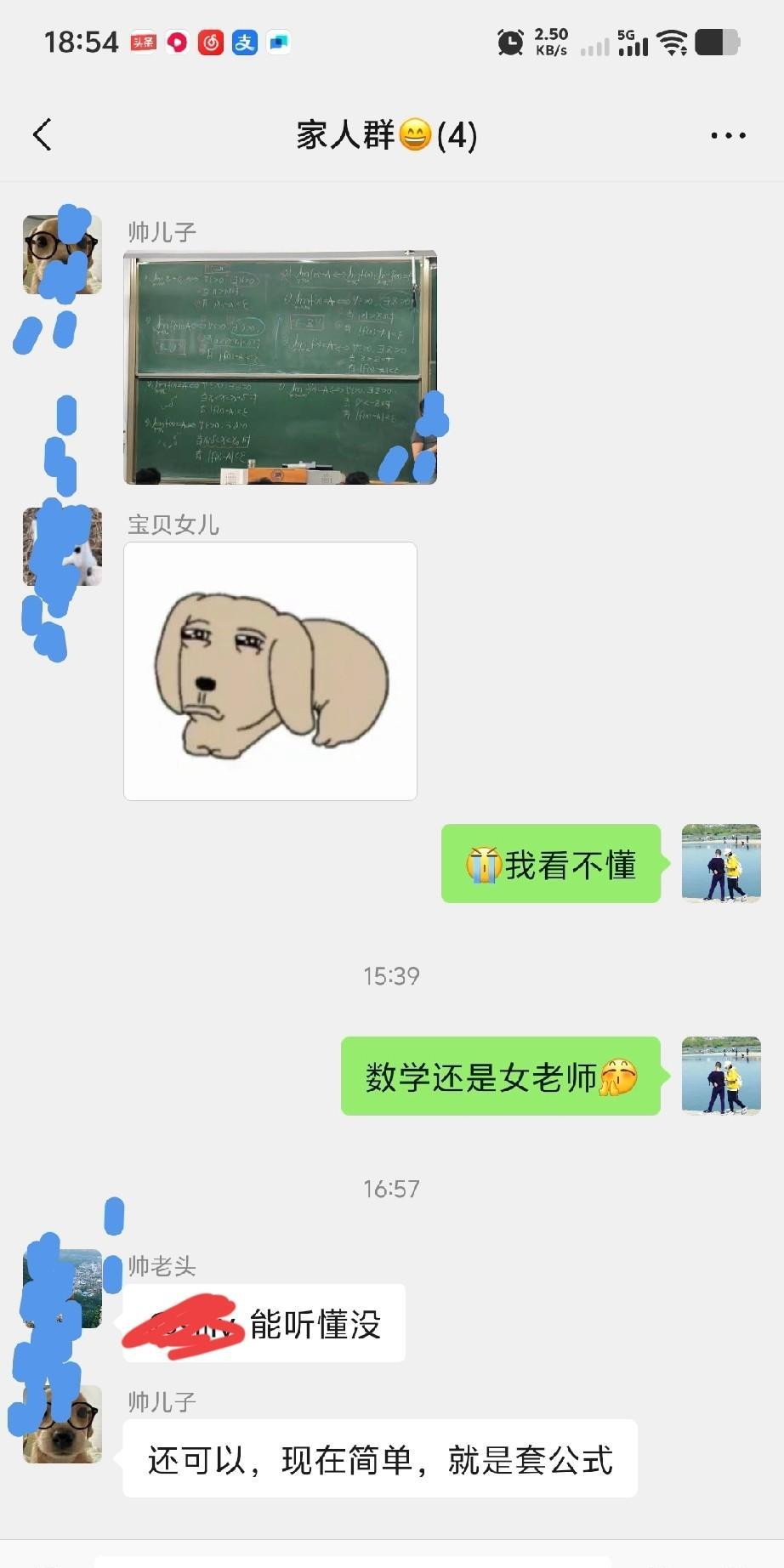 突然,家人群里面,收到一张照片。在呼市读大一的儿子,上数学课,女老师板书的照片。 我这个没上过大学的人,看着密密麻麻的字母,公式,像看天书一样的,什么也看不懂。 老公问儿子:“能听懂没?” 儿子说,“还可以,现在简单,就是套公式”。 没文化,真可怕,说的就是我吧!我压根儿什么也看不明白啊! 突然想起,2019年,我还想让女儿中考过后,去读定向师范生。女儿幸好有自己的主见,去上了高中,读了大学。 如果时光可以倒流,1995年,我肯定不去临沂读中专,一定要上高中,考大学。这也只能是一辈子的遗憾了……