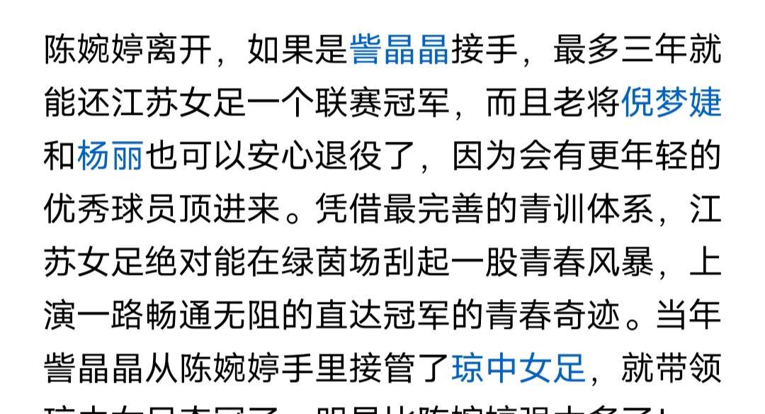 这个天津自媒体人又来损陈婉婷了,他是黑陈婉婷、黑江苏女足的专业户,当然,他也经常黑王霜她们。 看了他刚刚发的文章,这次终于没有藏着掖着,借助着陈婉婷与江苏省足协的合同到期,他在极力的想把天津的訾晶晶推给江苏女足当主帅。 我不想评价訾晶晶,因为訾晶晶还真与陈婉婷没有可比性,在文化底蕴、足球理念、国际视野、训练体系建设、比赛阅读水平、技战术打法运用等各方面,訾晶晶连陈婉婷的尾灯都看不到。 退一万步说,江苏女足再怎么样,除非江苏省足协全体高层都喝高了劣质酒,否则聘请訾晶晶的可能性绝对等于0,连一秒钟的考虑都不会有。 联赛刚刚落幕,年度接近尾声,有些俱乐部已经开始布局下一个赛季的主帅人选,毕竟真正的优质教练员凤毛麟角,尤其在中国少之又少。 我认为,江苏省足协最佳的选项是挽留陈婉婷,其次的选项是大胆任用本省籍主帅,比如泰州女足青训教头、泰州男足主帅周高萍就是可以一试的人选。