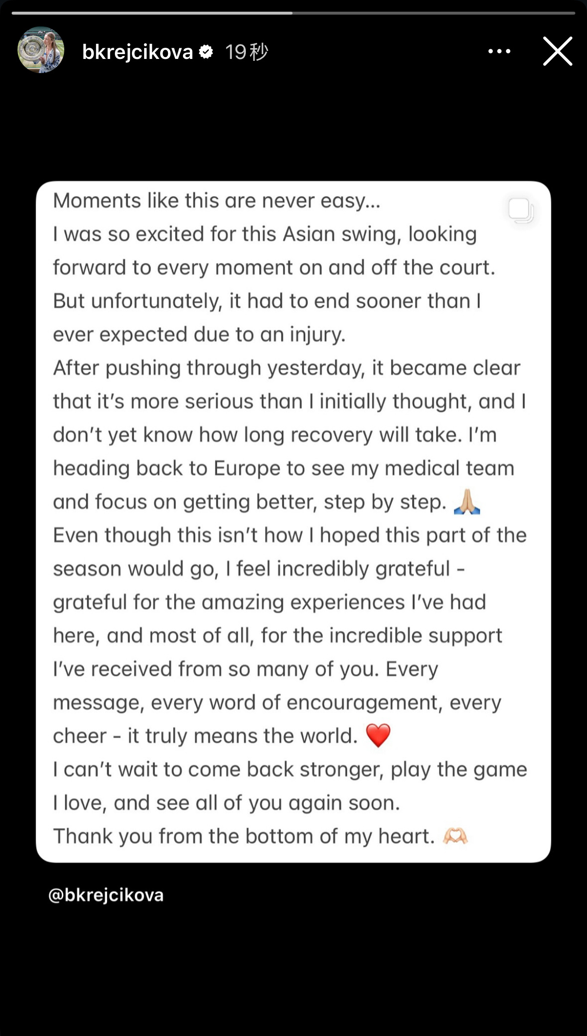 克雷吉茨科娃发文宣布因伤提前告别亚洲赛季⬇️