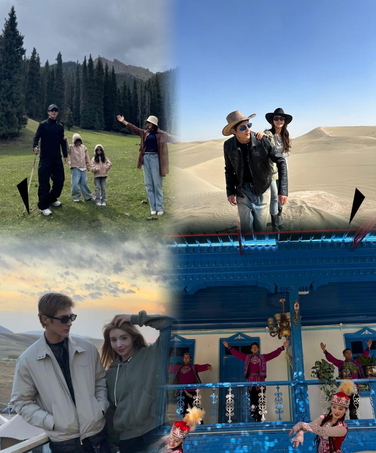 姜潮麦迪娜一家四口游伊犁!姜潮分享一家四口游新疆的画面,夫妻俩紧紧依偎在一起,女